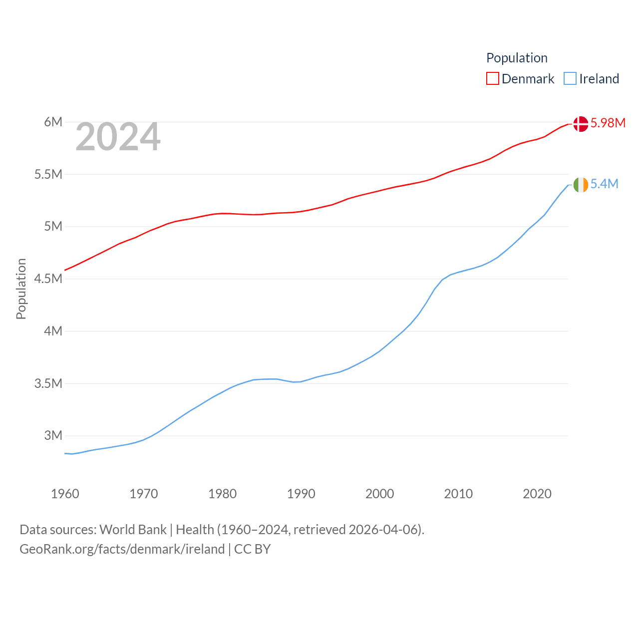 Denmark has a population of 5.98M (ranked 114/197), compared with 5.4M in Ireland (ranked 120/197). Denmark's land area is 15,444 sq mi versus 26,599 sq mi for Ireland (ranked 130th vs. 119th).