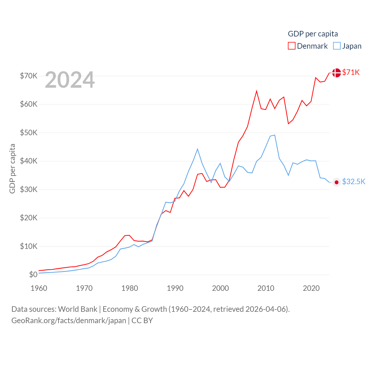 By GDP, Denmark ranks 37/197 ($425B) and Japan ranks 4/197 ($4.03T). By GDP per capita, Denmark ranks 12/197 ($71,026), while Japan ranks 38/197 ($32,487).