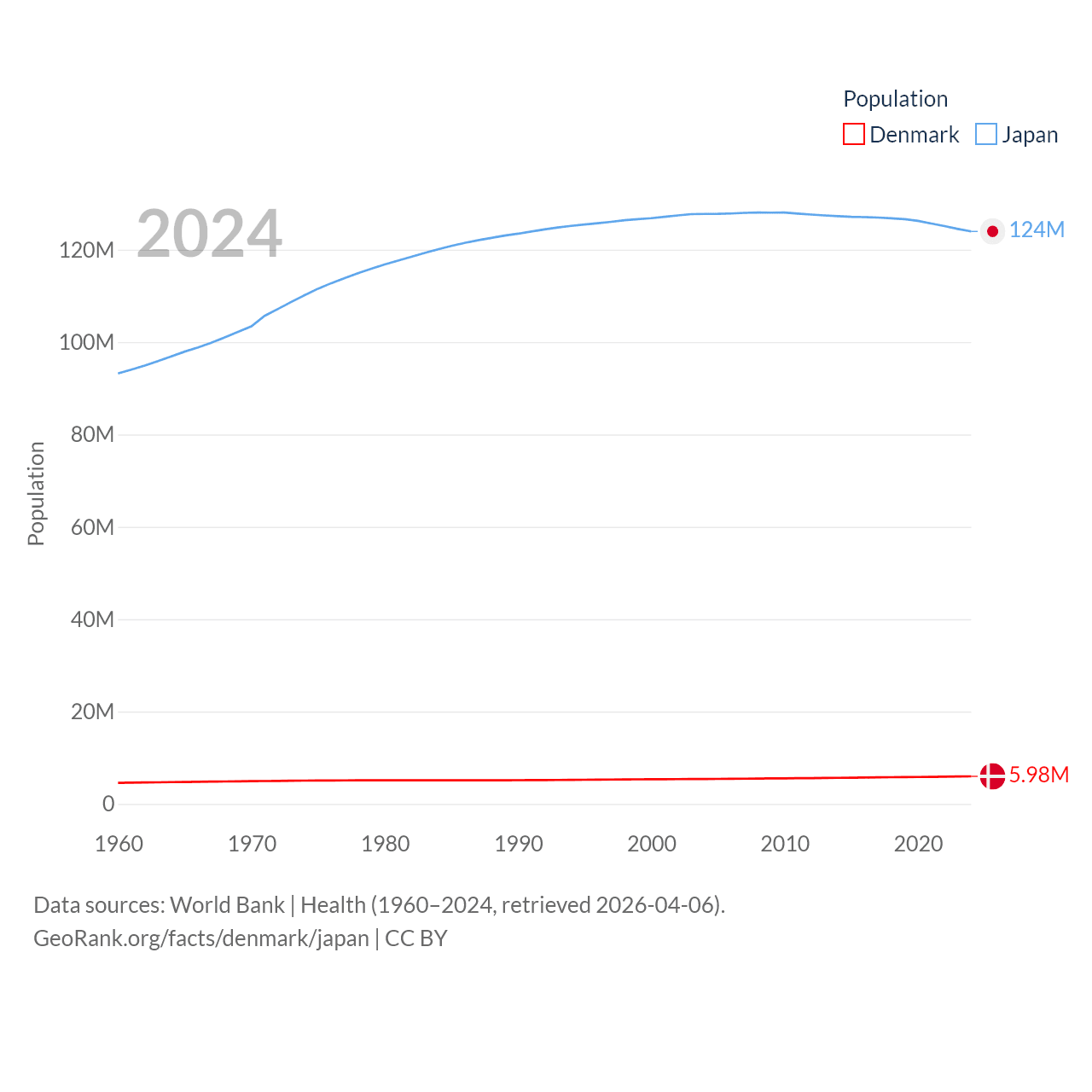 Denmark has a population of 5.98M (ranked 114/197), compared with 124M in Japan (ranked 12/197). Denmark's land area is 15,444 sq mi versus 140,761 sq mi for Japan (ranked 130th vs. 61st).