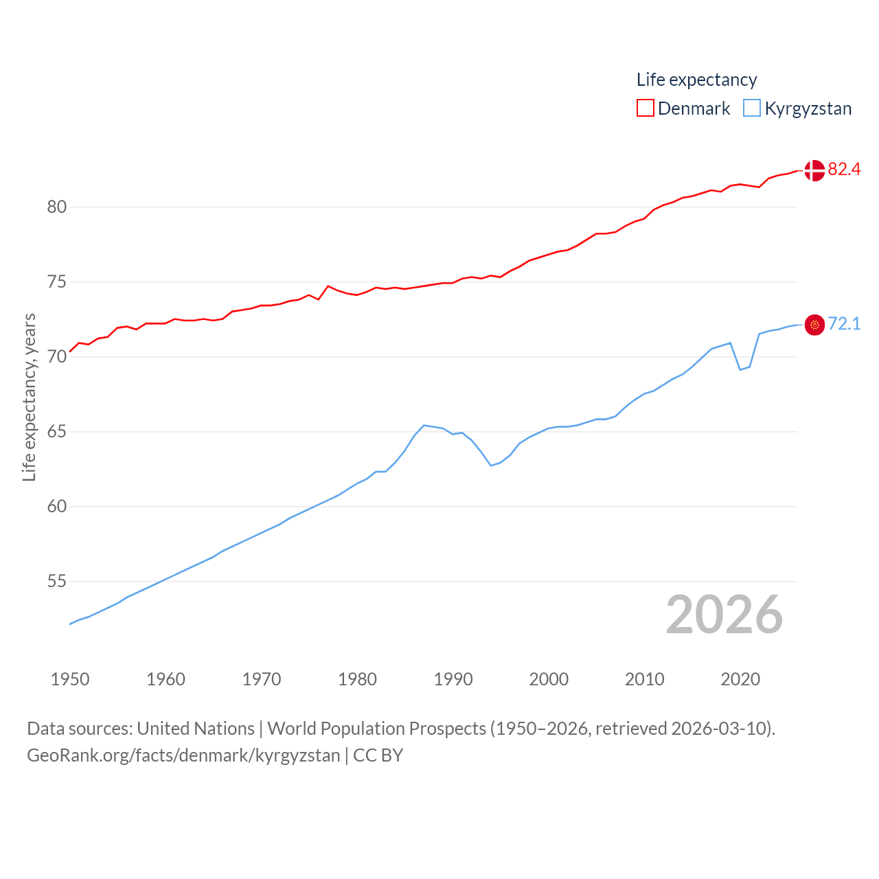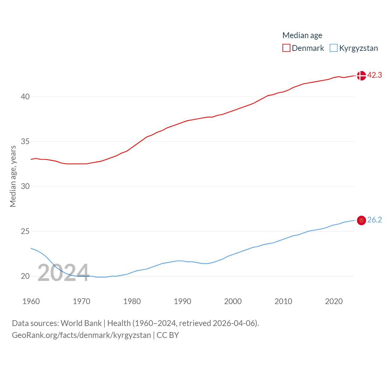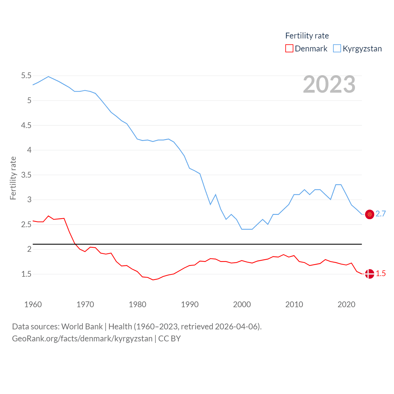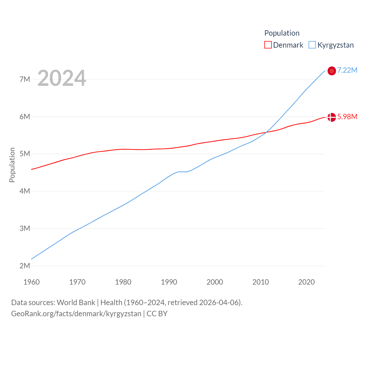Denmark has a population of 5.98M (ranked 114/197), compared with 7.22M in Kyrgyzstan (ranked 106/197). Denmark's land area is 15,444 sq mi versus 74,054 sq mi for Kyrgyzstan (ranked 130th vs. 86th).