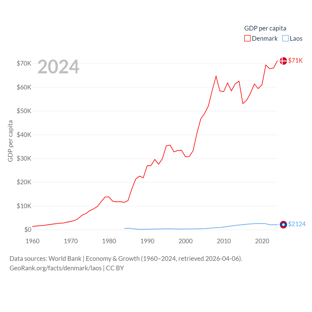 By GDP, Denmark ranks 37/197 ($425B) and Laos ranks 139/197 ($16.5B). By GDP per capita, Denmark ranks 12/197 ($71,026), while Laos ranks 155/197 ($2,124).