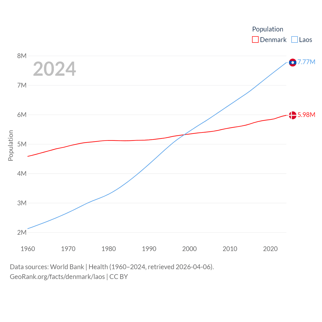 Denmark has a population of 5.98M (ranked 114/197), compared with 7.77M in Laos (ranked 103/197). Denmark's land area is 15,444 sq mi versus 89,112 sq mi for Laos (ranked 130th vs. 79th).