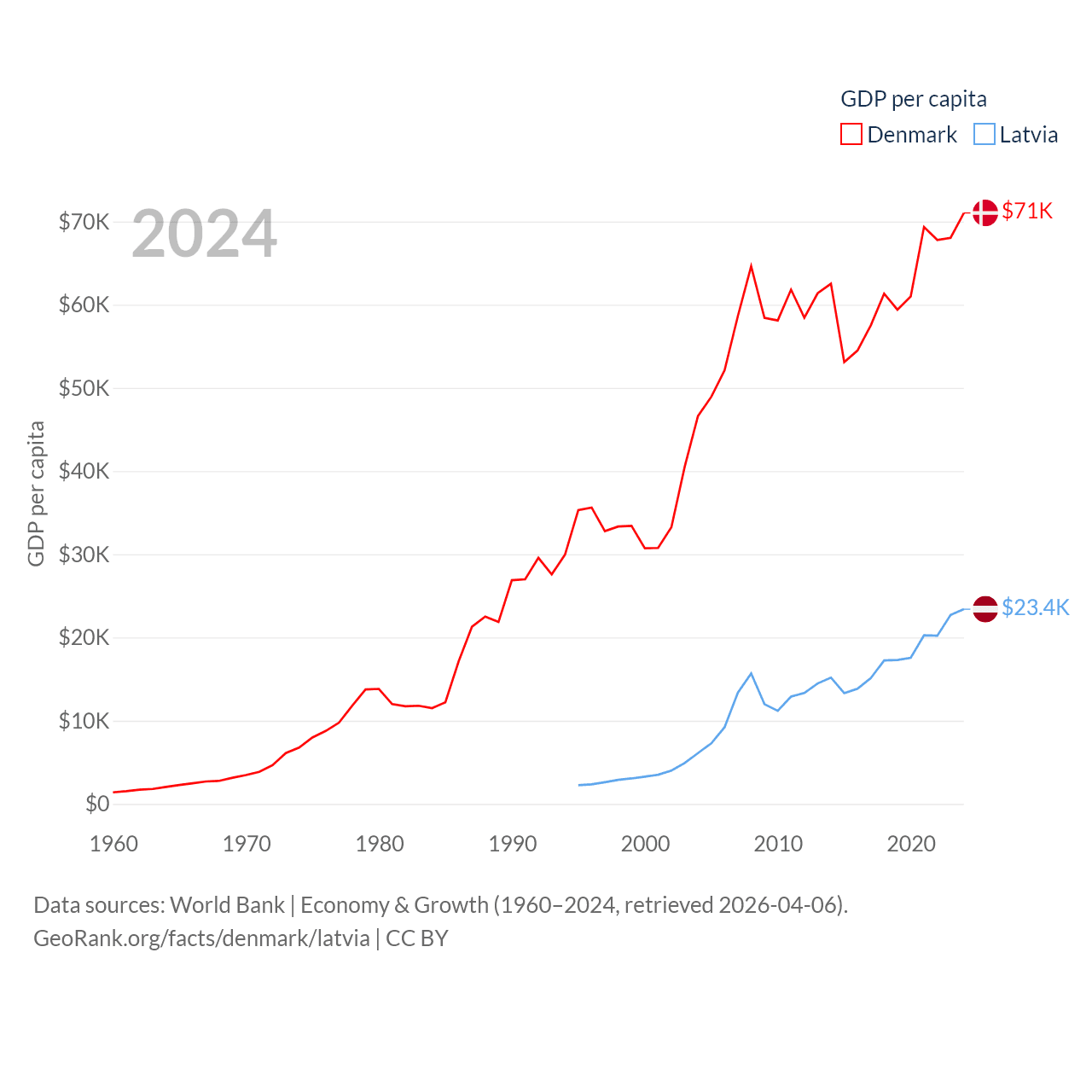 By GDP, Denmark ranks 37/197 ($425B) and Latvia ranks 99/197 ($43.7B). By GDP per capita, Denmark ranks 12/197 ($71,026), while Latvia ranks 54/197 ($23,409).