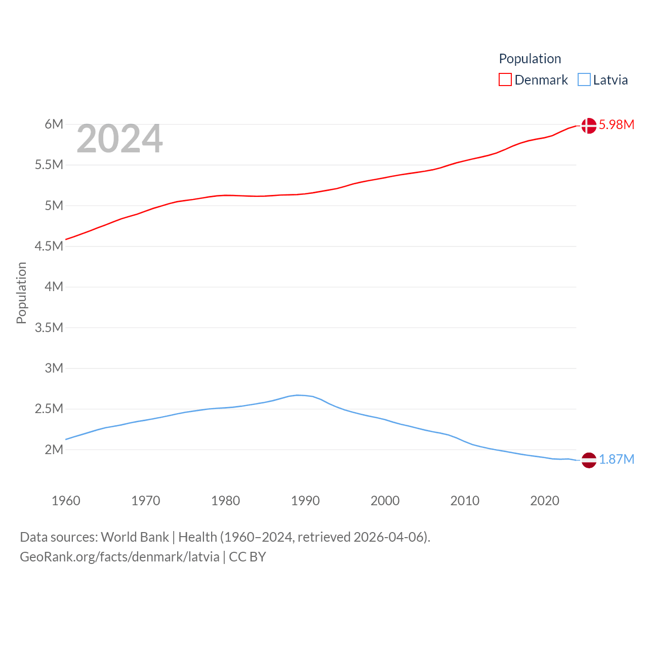 Denmark has a population of 5.98M (ranked 114/197), compared with 1.87M in Latvia (ranked 149/197). Denmark's land area is 15,444 sq mi versus 24,027 sq mi for Latvia (ranked 130th vs. 121st).