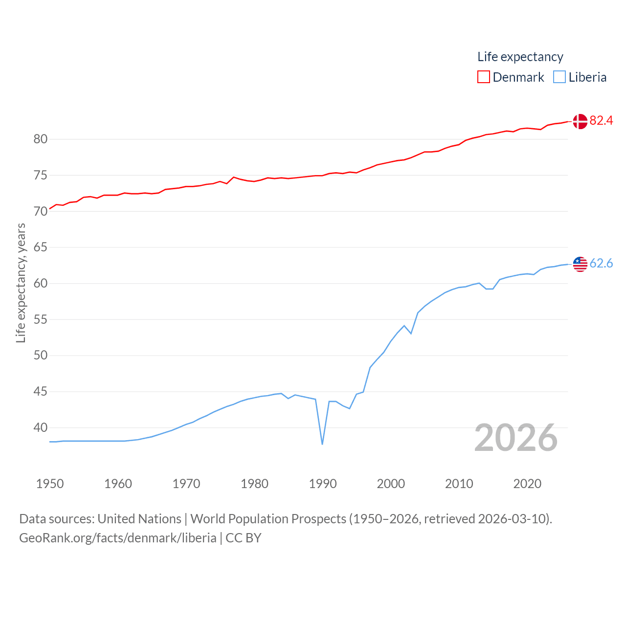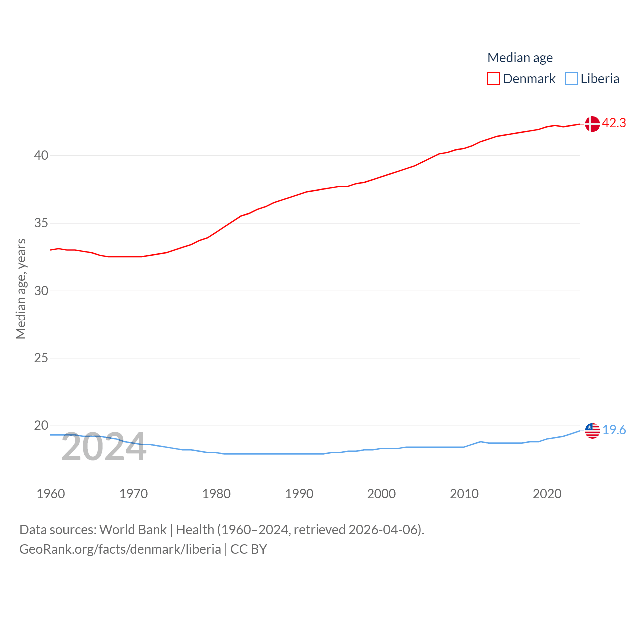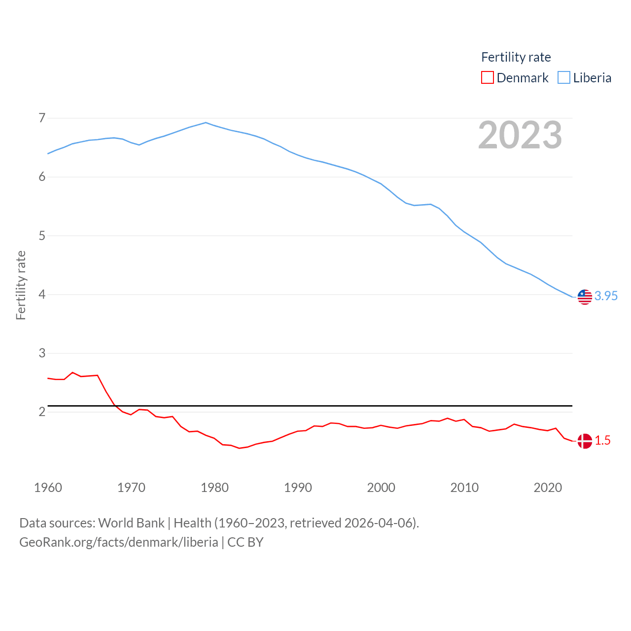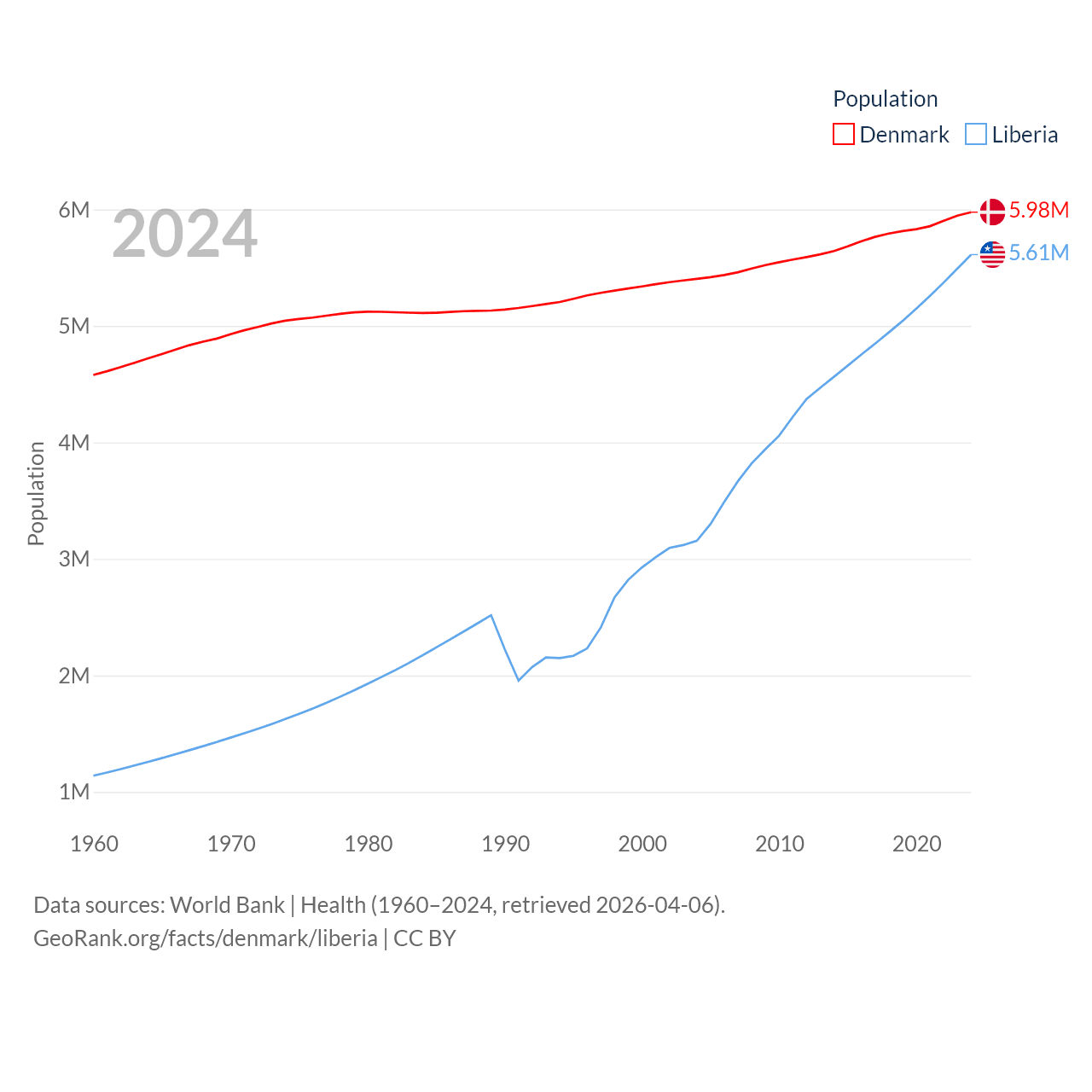 Denmark has a population of 5.98M (ranked 114/197), compared with 5.61M in Liberia (ranked 117/197). Denmark's land area is 15,444 sq mi versus 37,189 sq mi for Liberia (ranked 130th vs. 106th).