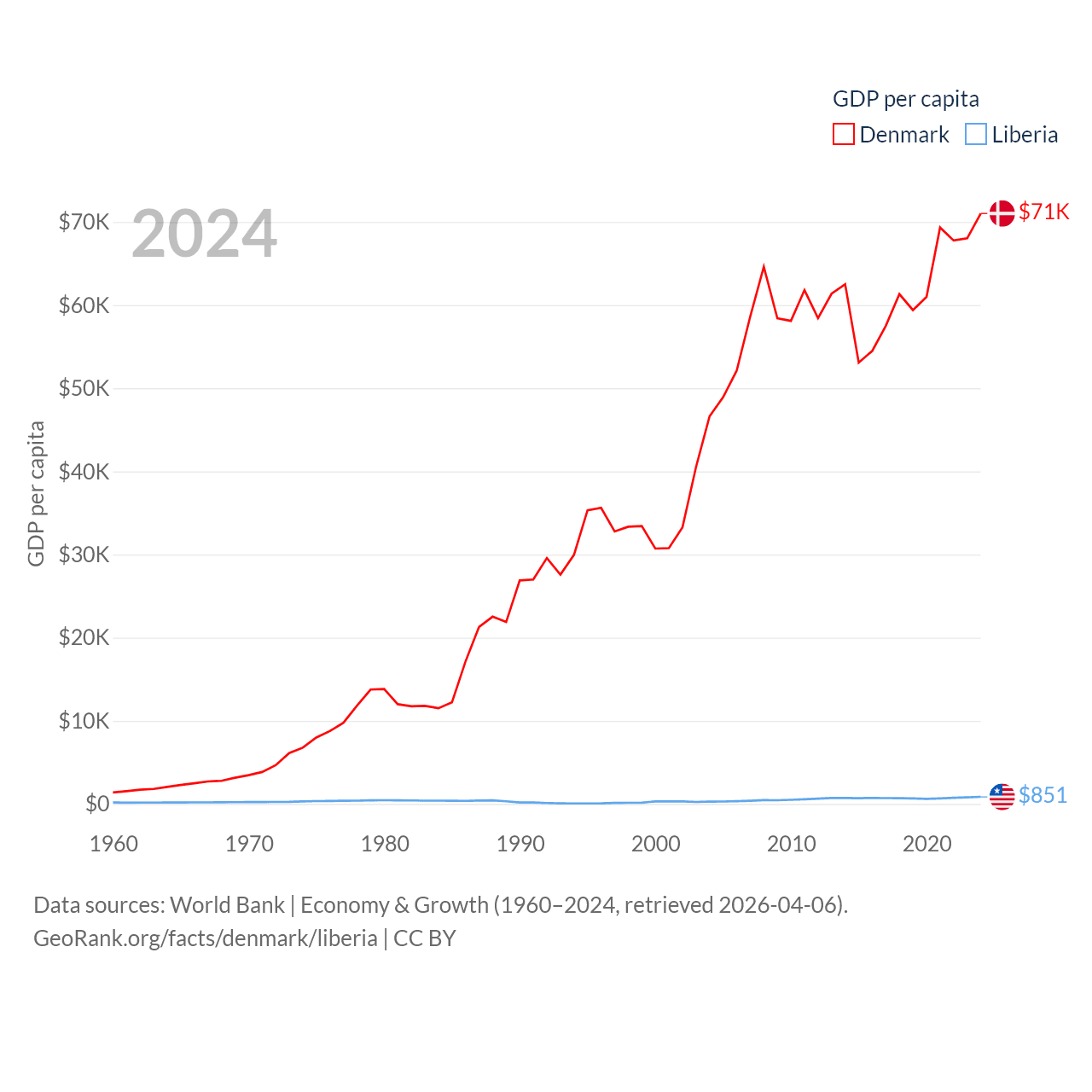By GDP, Denmark ranks 37/197 ($425B) and Liberia ranks 163/197 ($4.78B). By GDP per capita, Denmark ranks 12/197 ($71,026), while Liberia ranks 184/197 ($851).