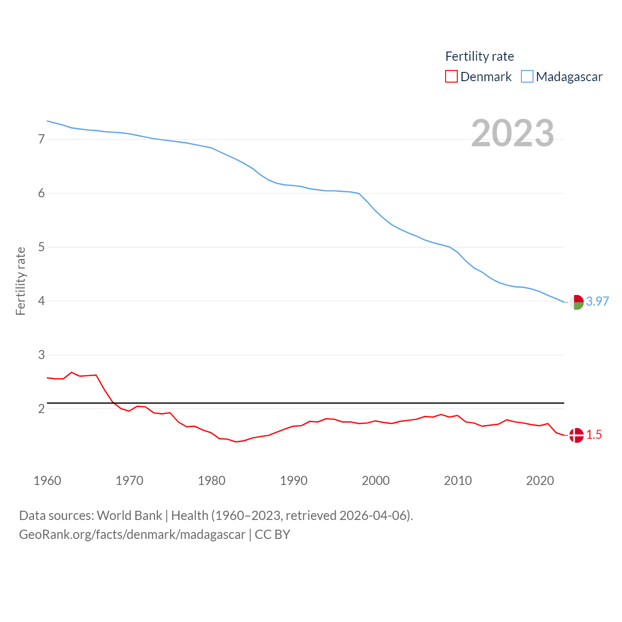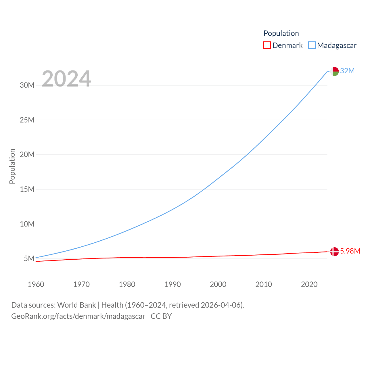Denmark has a population of 5.98M (ranked 114/197), compared with 32M in Madagascar (ranked 49/197). Denmark's land area is 15,444 sq mi versus 224,634 sq mi for Madagascar (ranked 130th vs. 44th).
