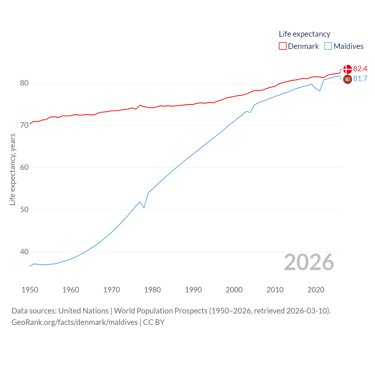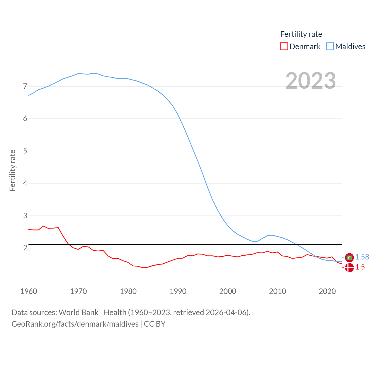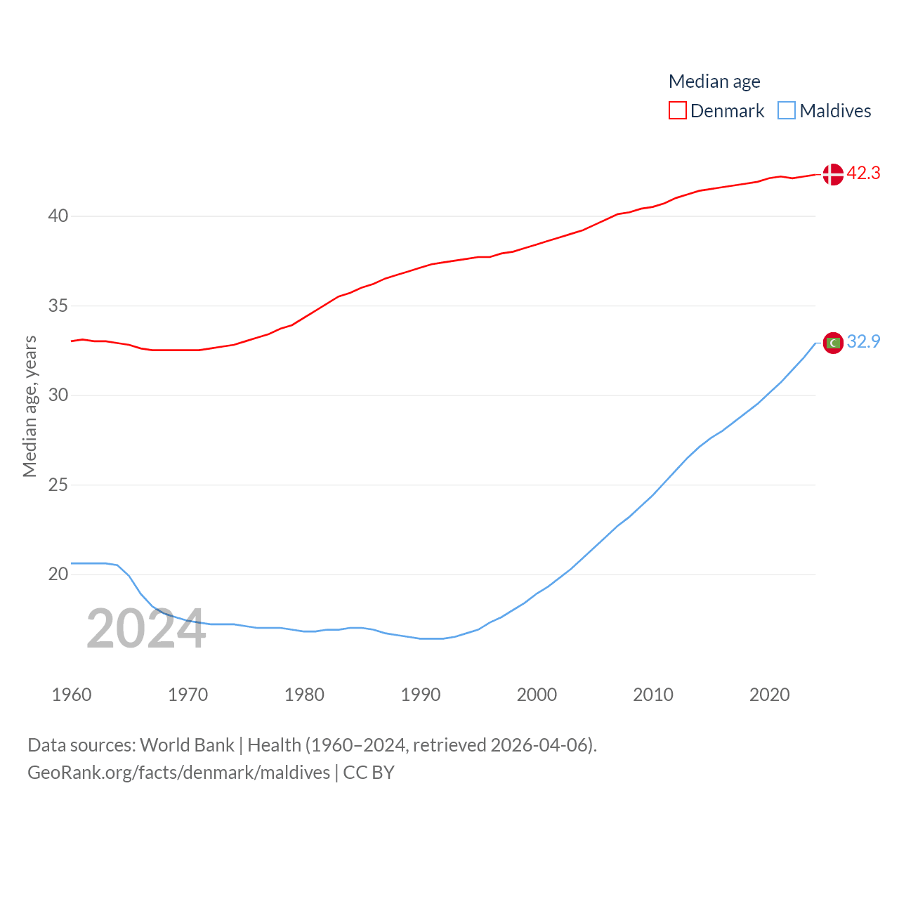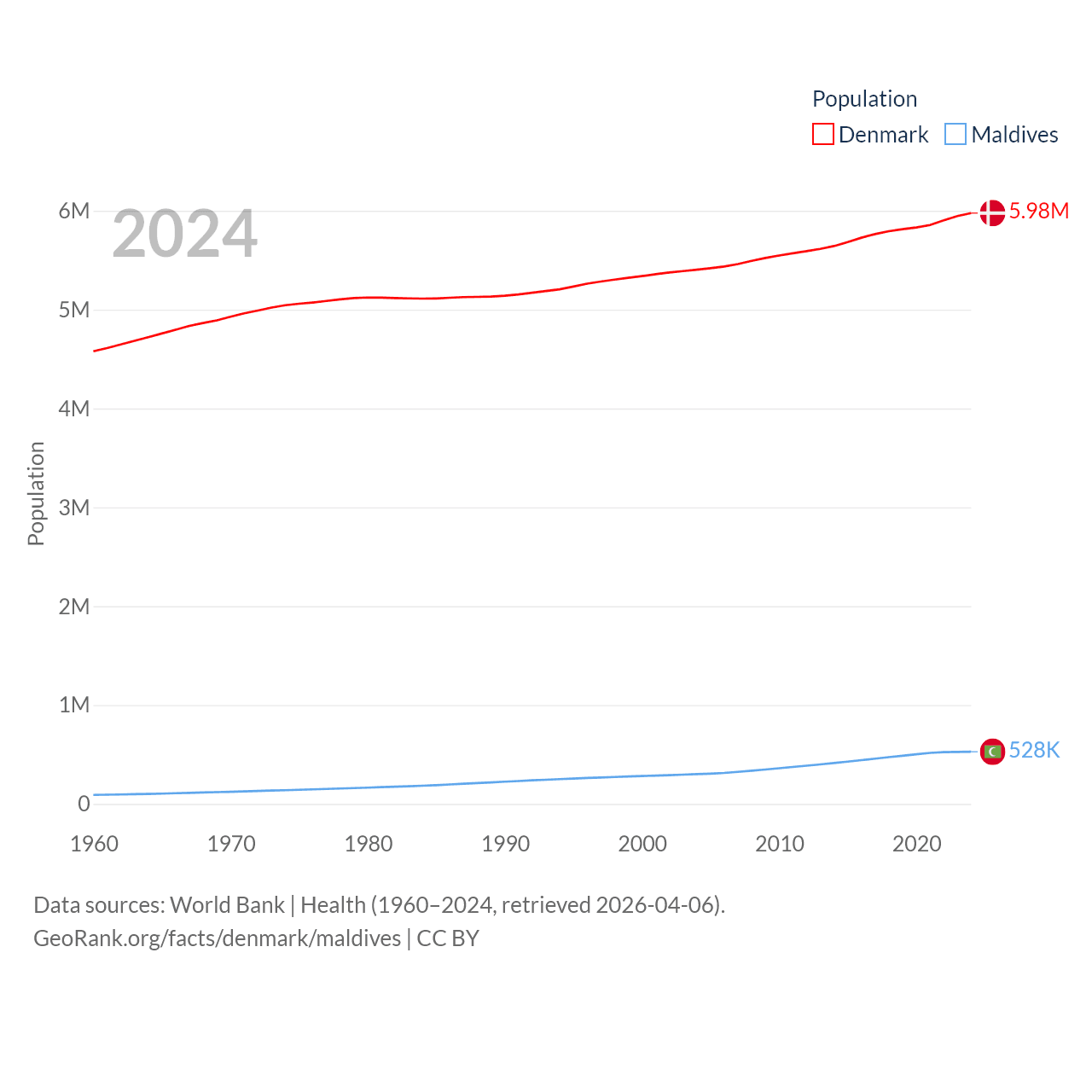 Denmark has a population of 5.98M (ranked 114/197), compared with 528K in Maldives (ranked 168/197). Denmark's land area is 15,444 sq mi versus 115.1 sq mi for Maldives (ranked 130th vs. 188th).