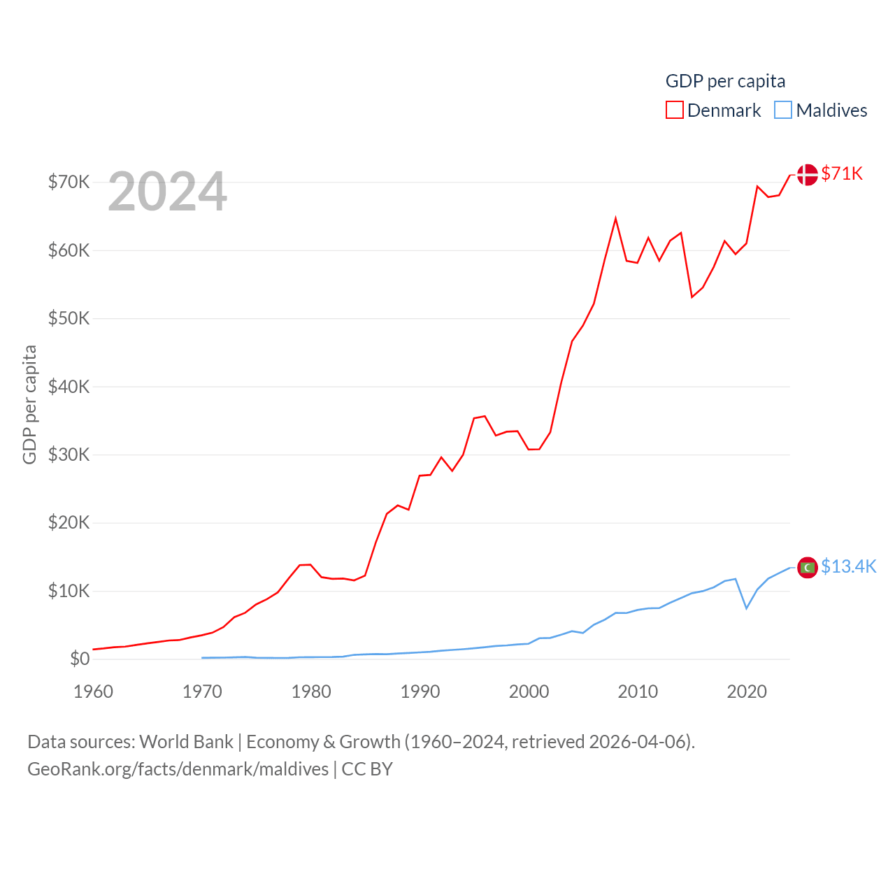 By GDP, Denmark ranks 37/197 ($425B) and Maldives ranks 159/197 ($7.06B). By GDP per capita, Denmark ranks 12/197 ($71,026), while Maldives ranks 75/197 ($13,379).