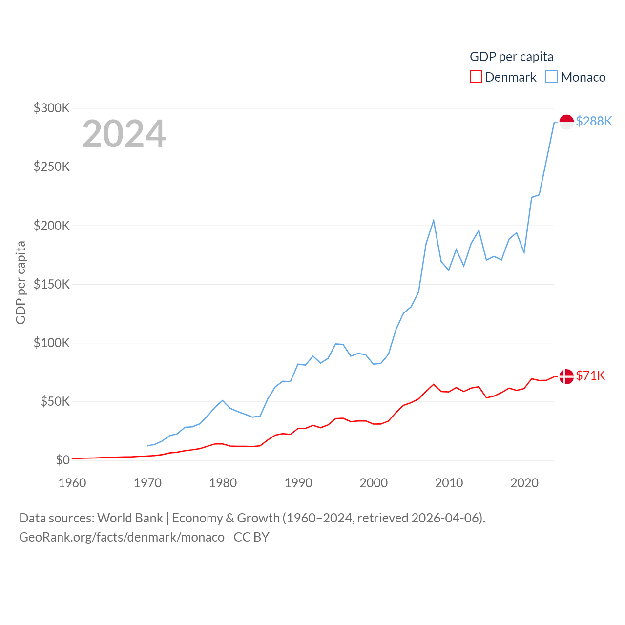 By GDP, Denmark ranks 37/197 ($425B) and Monaco ranks 152/197 ($11.1B). By GDP per capita, Denmark ranks 12/197 ($71,026), while Monaco ranks 1/197 ($288,001).