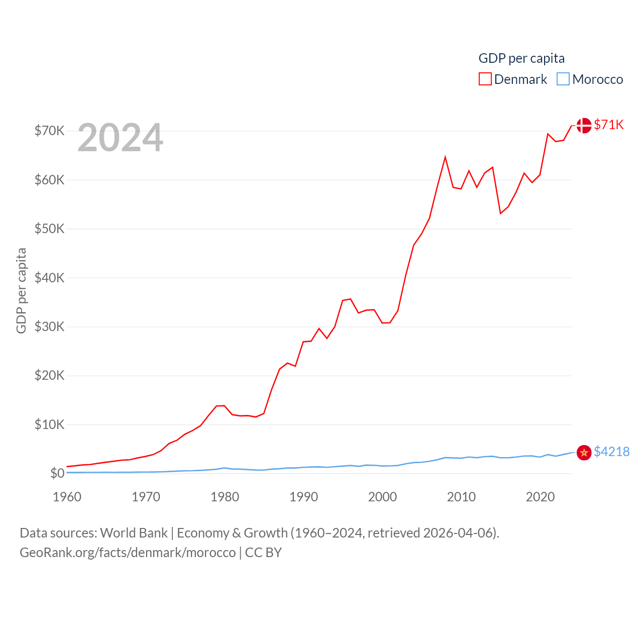 By GDP, Denmark ranks 37/197 ($425B) and Morocco ranks 58/197 ($161B). By GDP per capita, Denmark ranks 12/197 ($71,026), while Morocco ranks 127/197 ($4,218).
