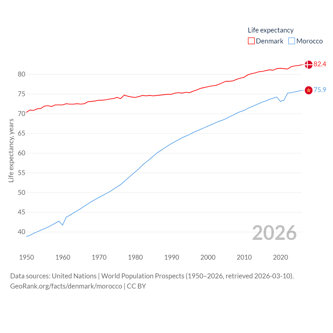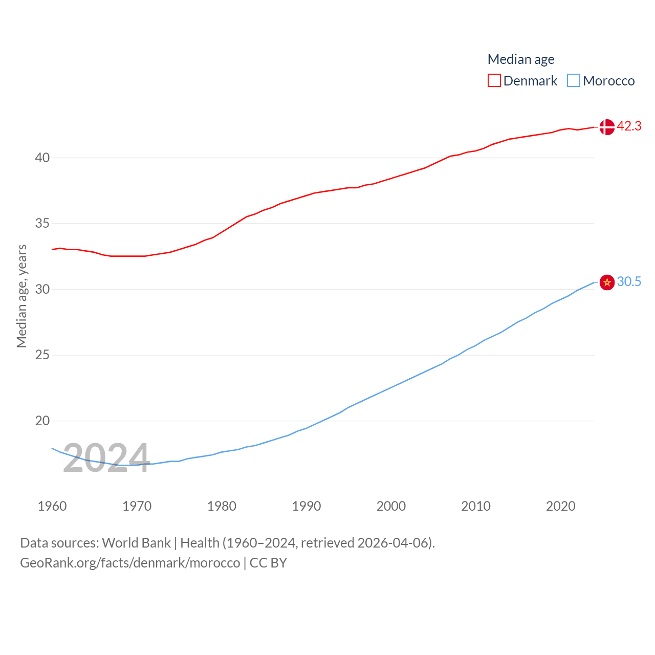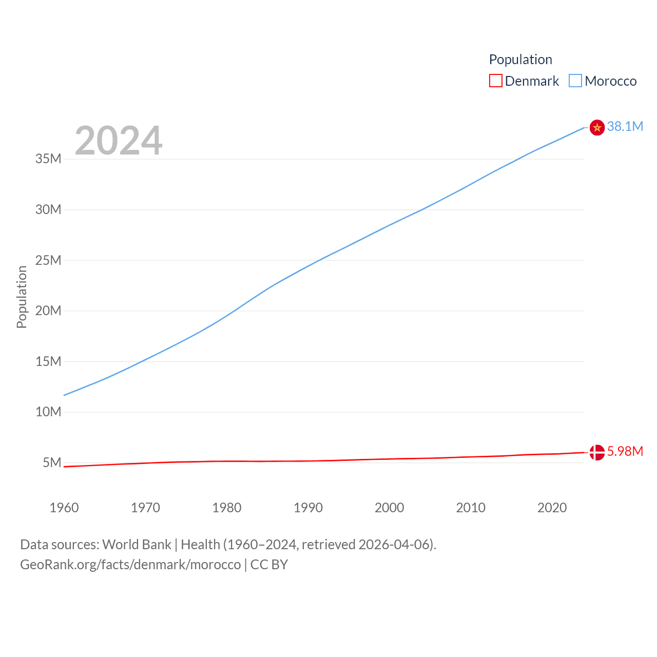 Denmark has a population of 5.98M (ranked 114/197), compared with 38.1M in Morocco (ranked 39/197). Denmark's land area is 15,444 sq mi versus 172,317 sq mi for Morocco (ranked 130th vs. 55th).