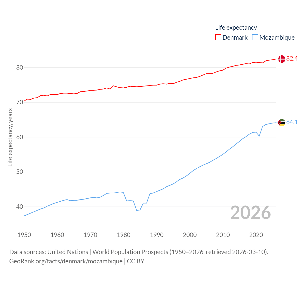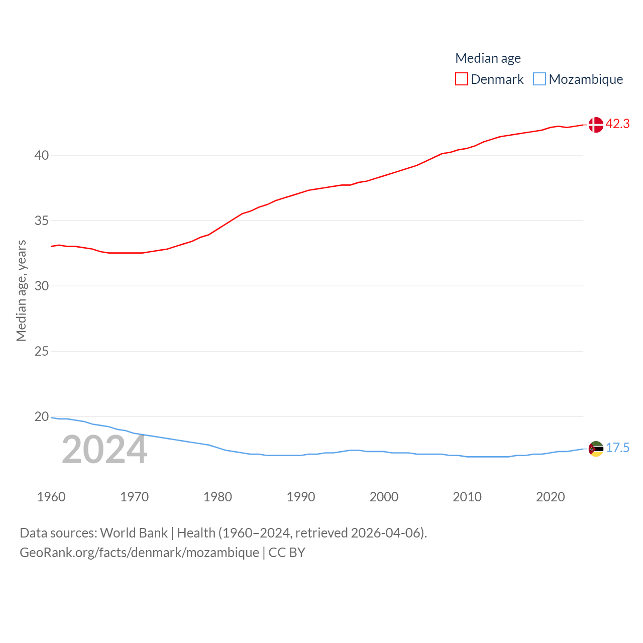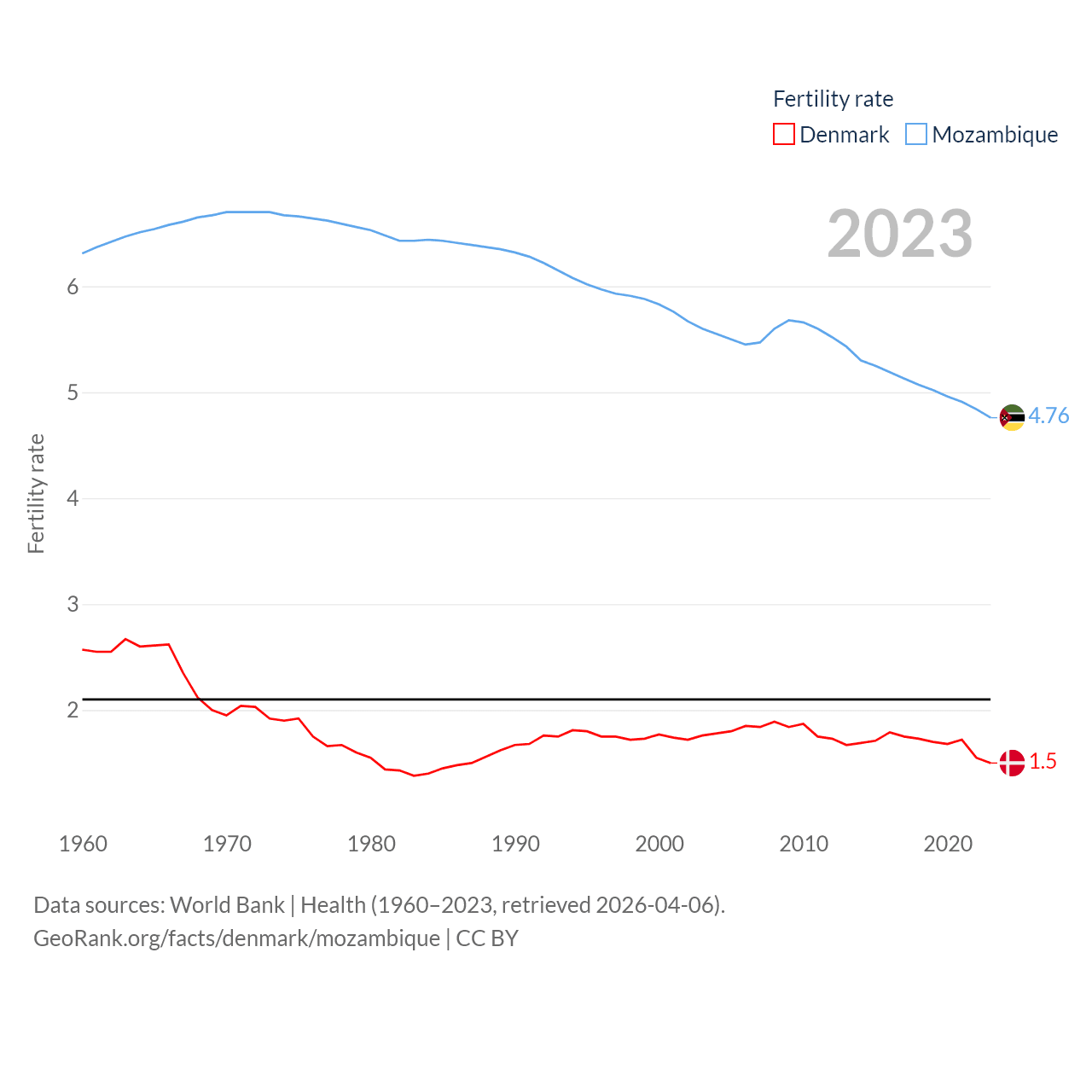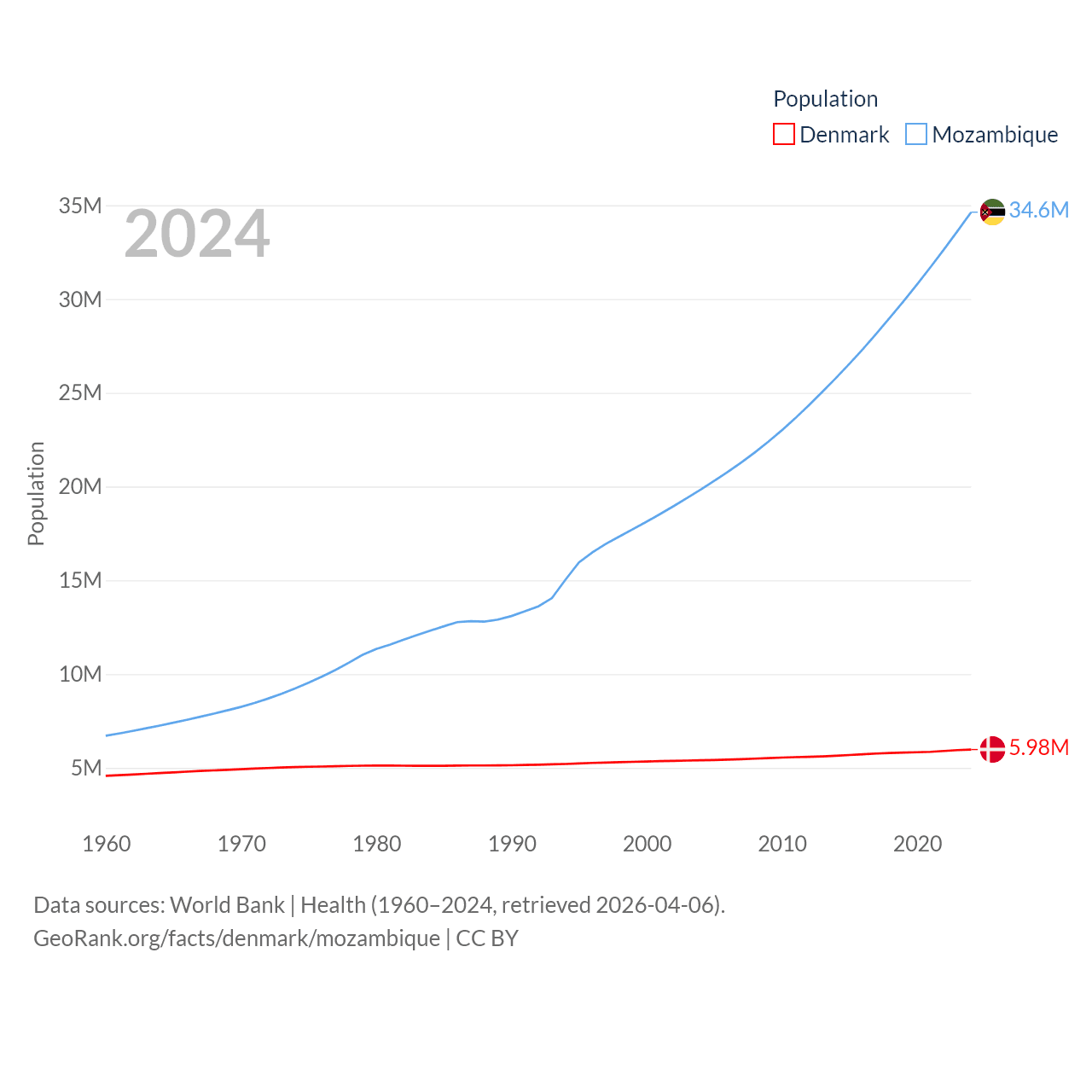 Denmark has a population of 5.98M (ranked 114/197), compared with 34.6M in Mozambique (ranked 46/197). Denmark's land area is 15,444 sq mi versus 303,623 sq mi for Mozambique (ranked 130th vs. 34th).