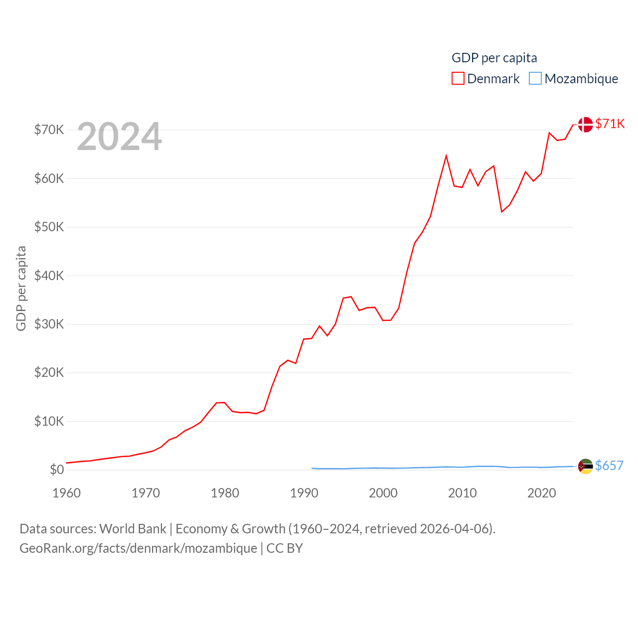 By GDP, Denmark ranks 37/197 ($425B) and Mozambique ranks 123/197 ($22.7B). By GDP per capita, Denmark ranks 12/197 ($71,026), while Mozambique ranks 189/197 ($657).