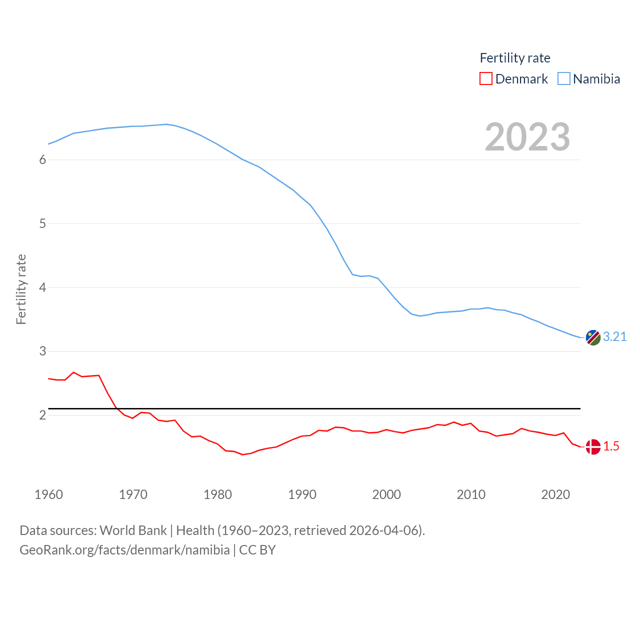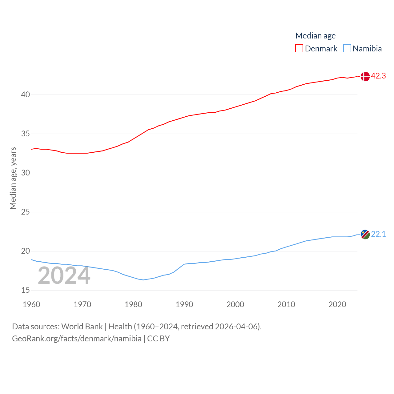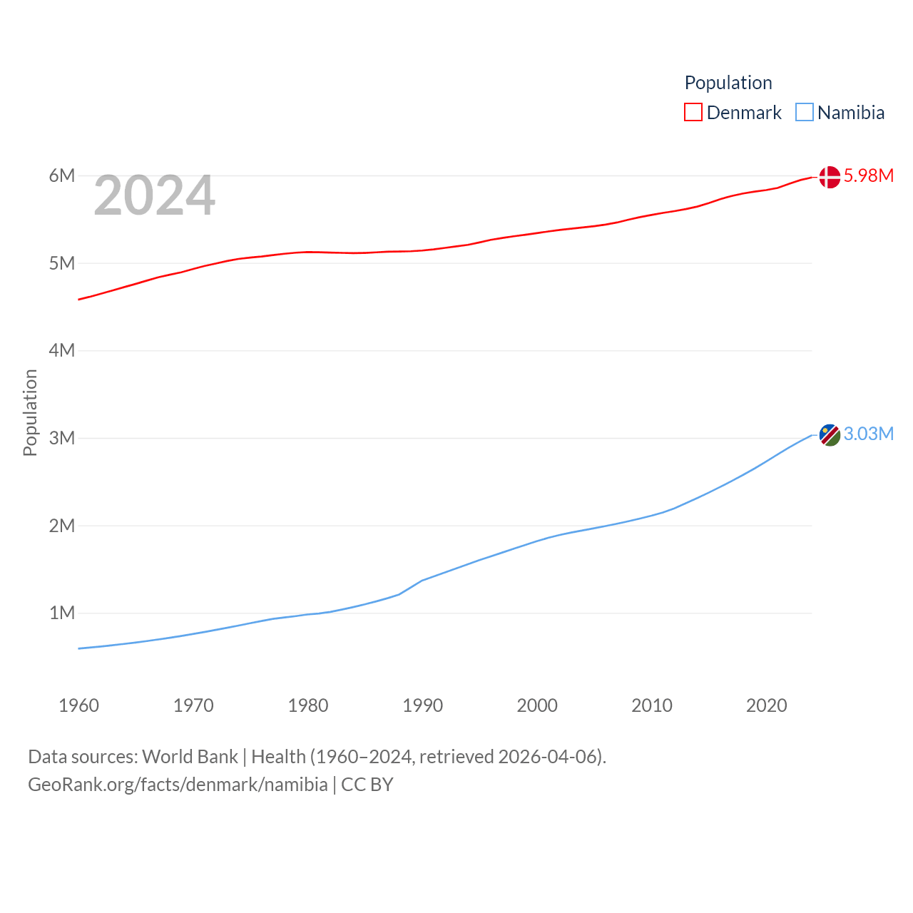 Denmark has a population of 5.98M (ranked 114/197), compared with 3.03M in Namibia (ranked 136/197). Denmark's land area is 15,444 sq mi versus 317,874 sq mi for Namibia (ranked 130th vs. 33rd).