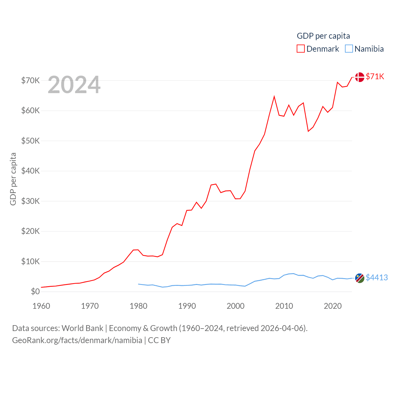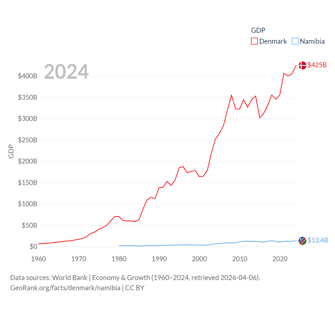 By GDP, Denmark ranks 37/197 ($425B) and Namibia ranks 147/197 ($13.4B). By GDP per capita, Denmark ranks 12/197 ($71,026), while Namibia ranks 126/197 ($4,413).