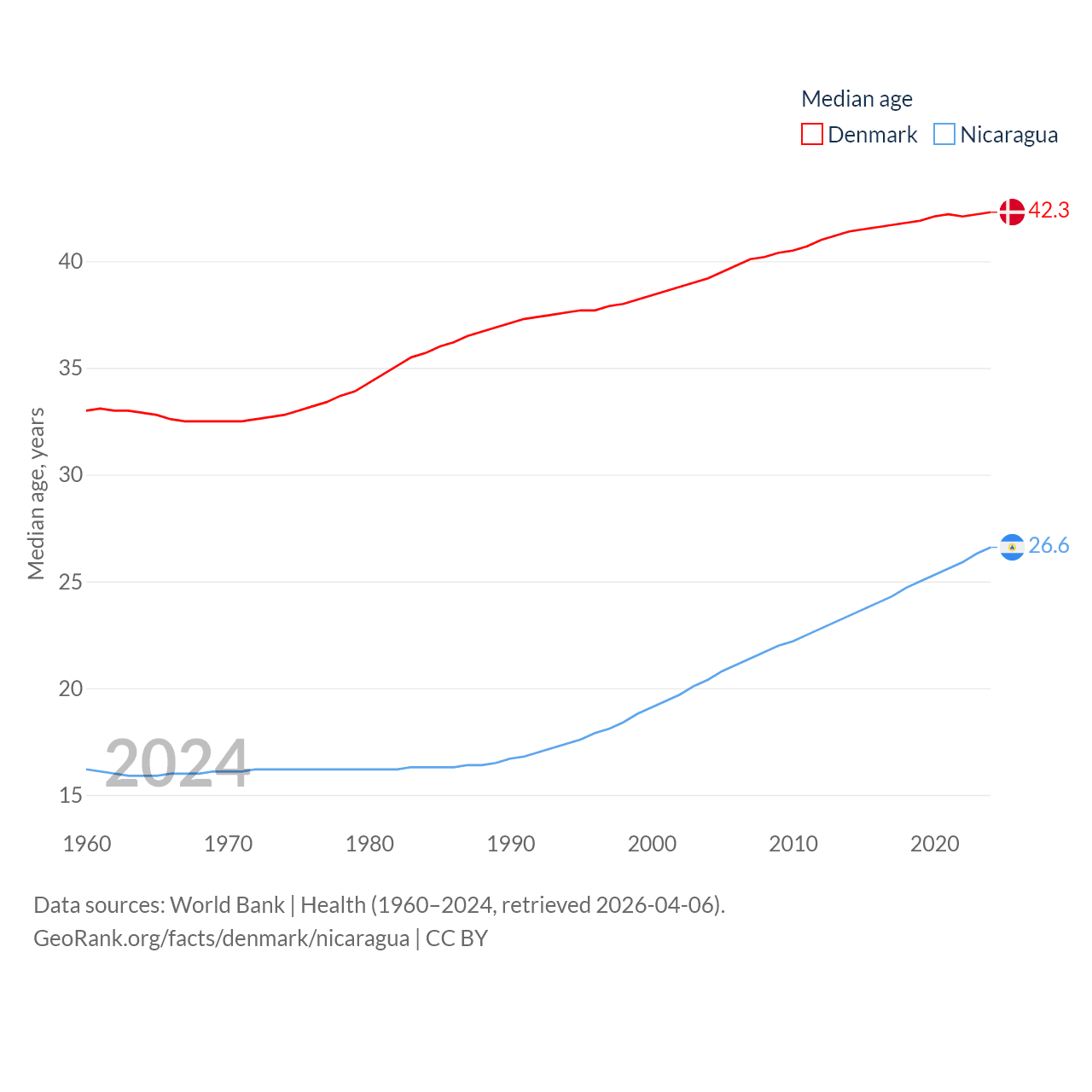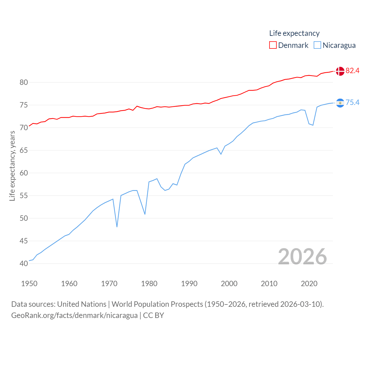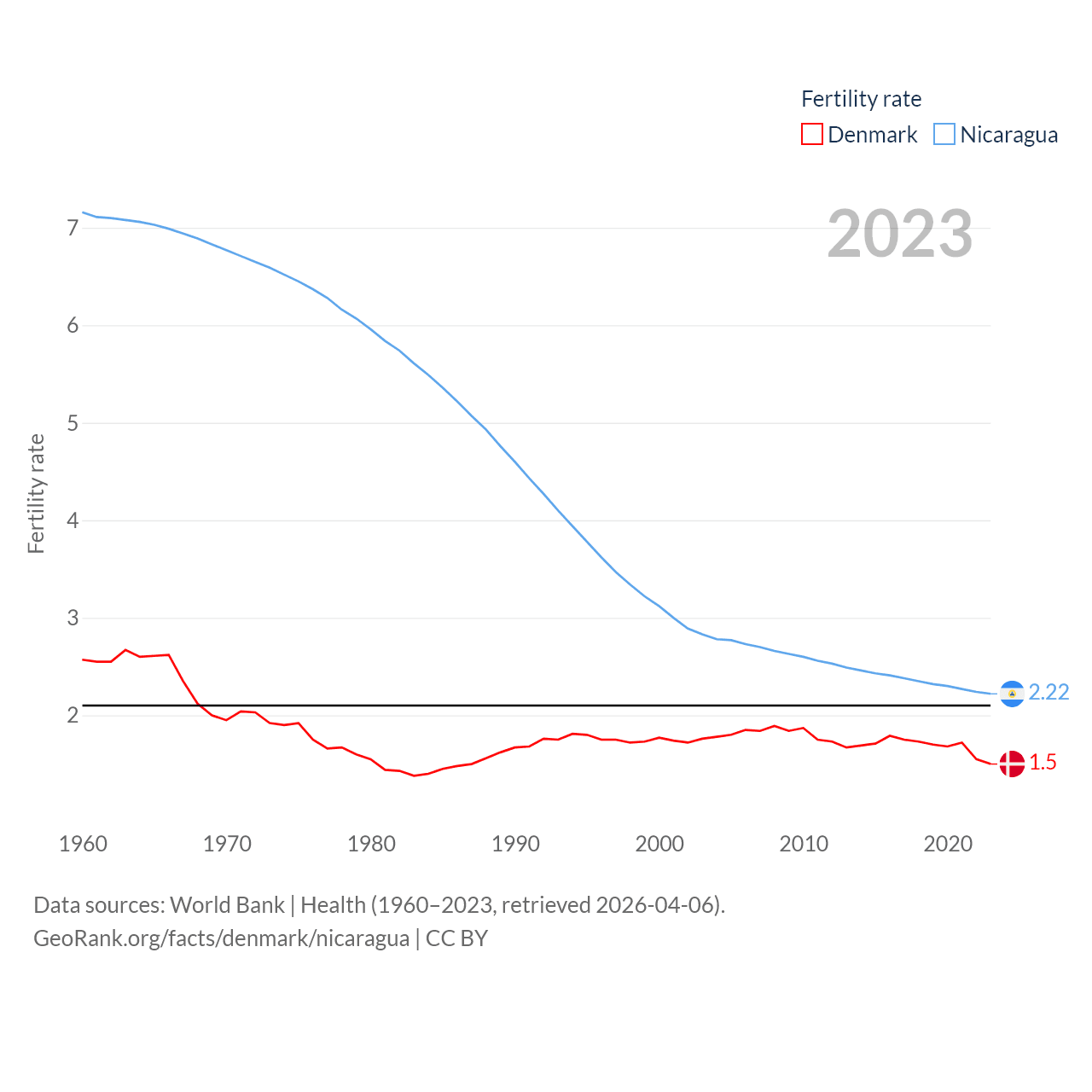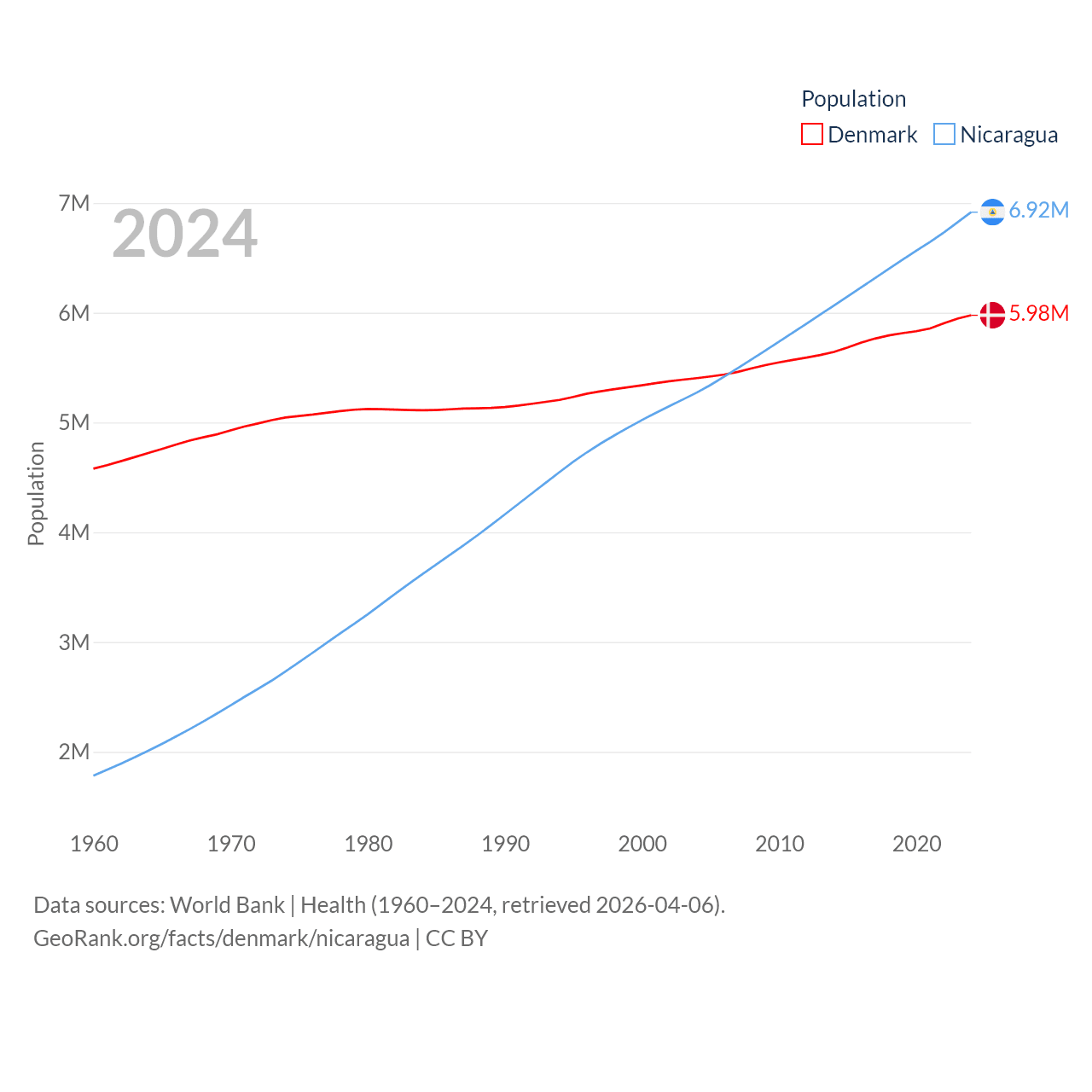 Denmark has a population of 5.98M (ranked 114/197), compared with 6.92M in Nicaragua (ranked 108/197). Denmark's land area is 15,444 sq mi versus 46,464 sq mi for Nicaragua (ranked 130th vs. 98th).