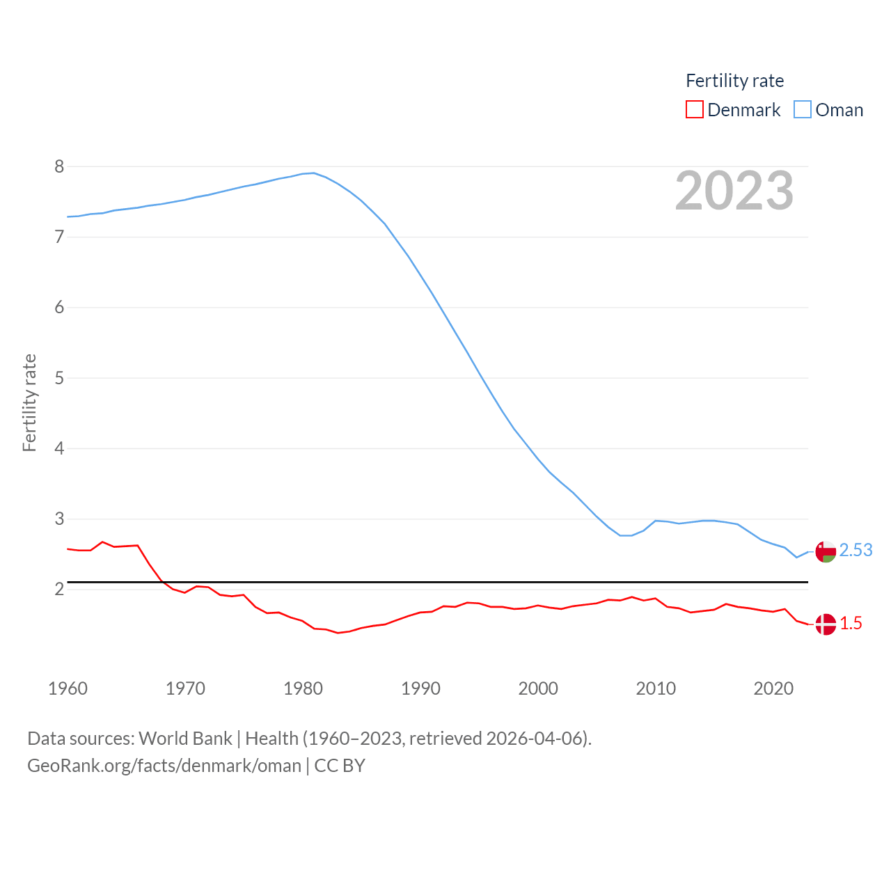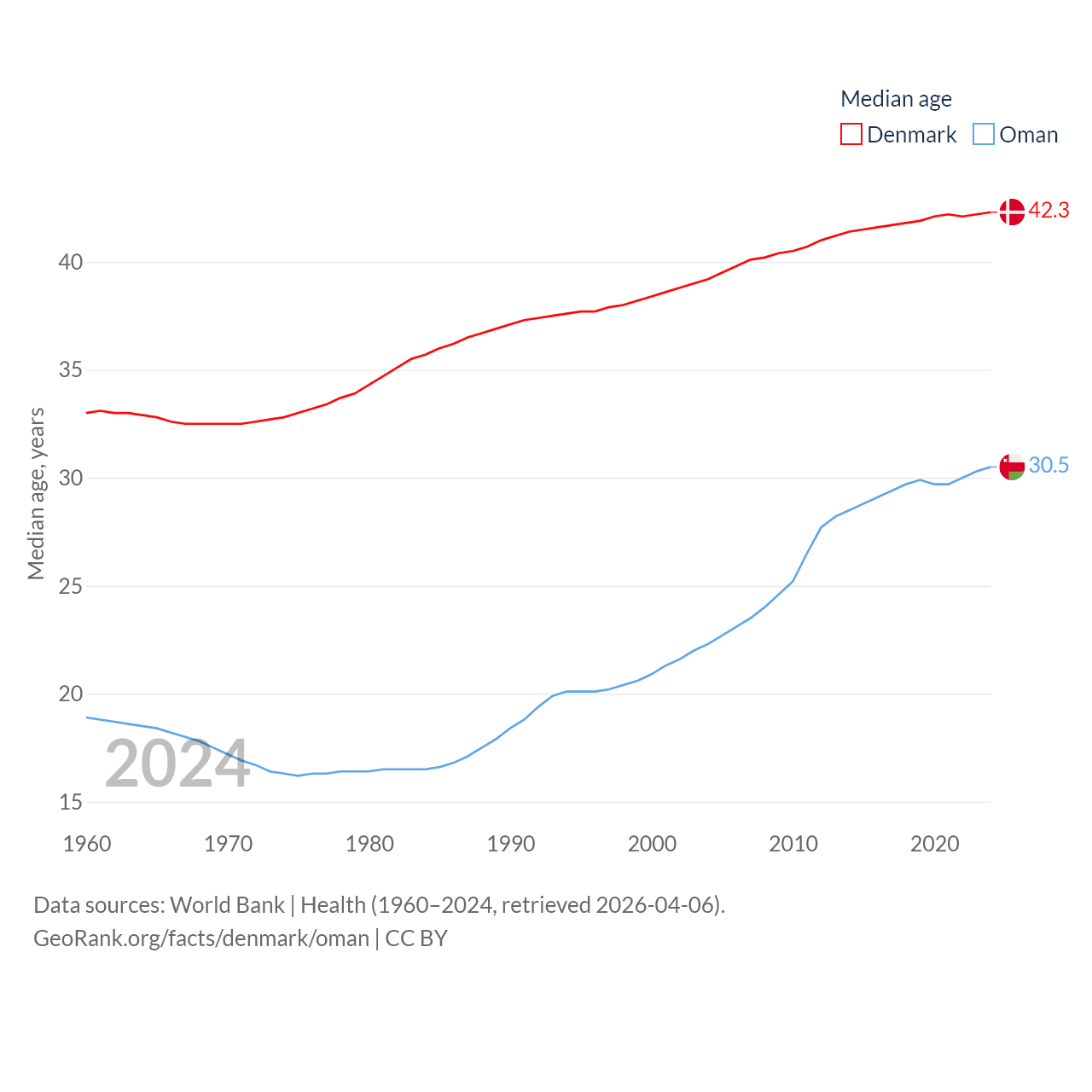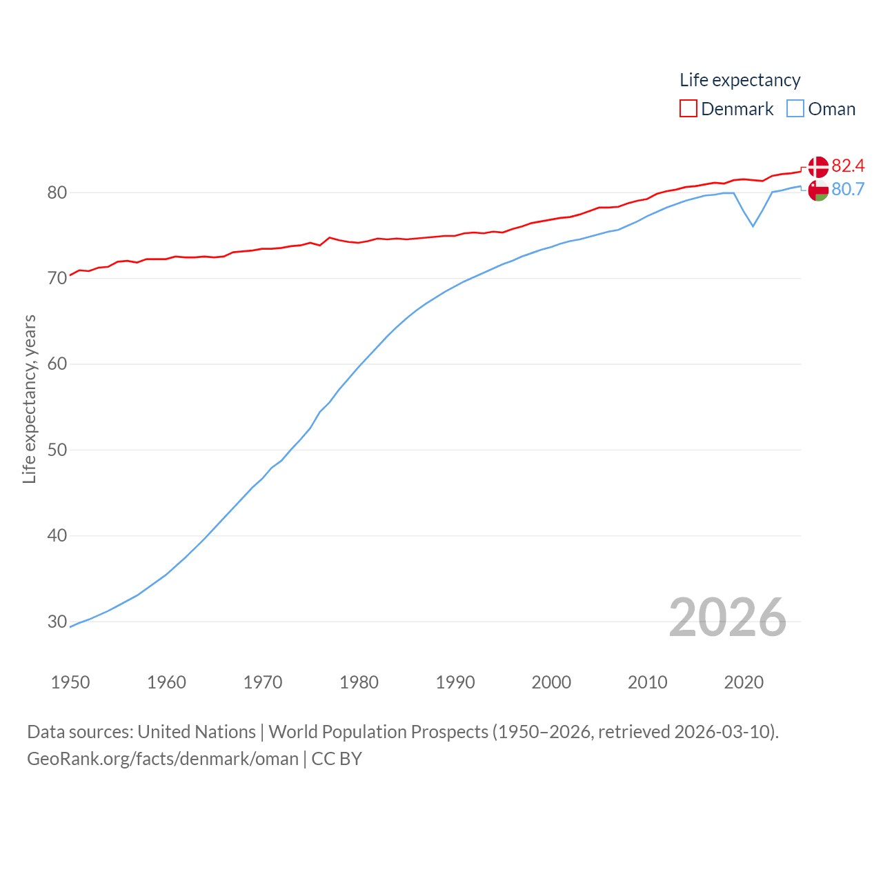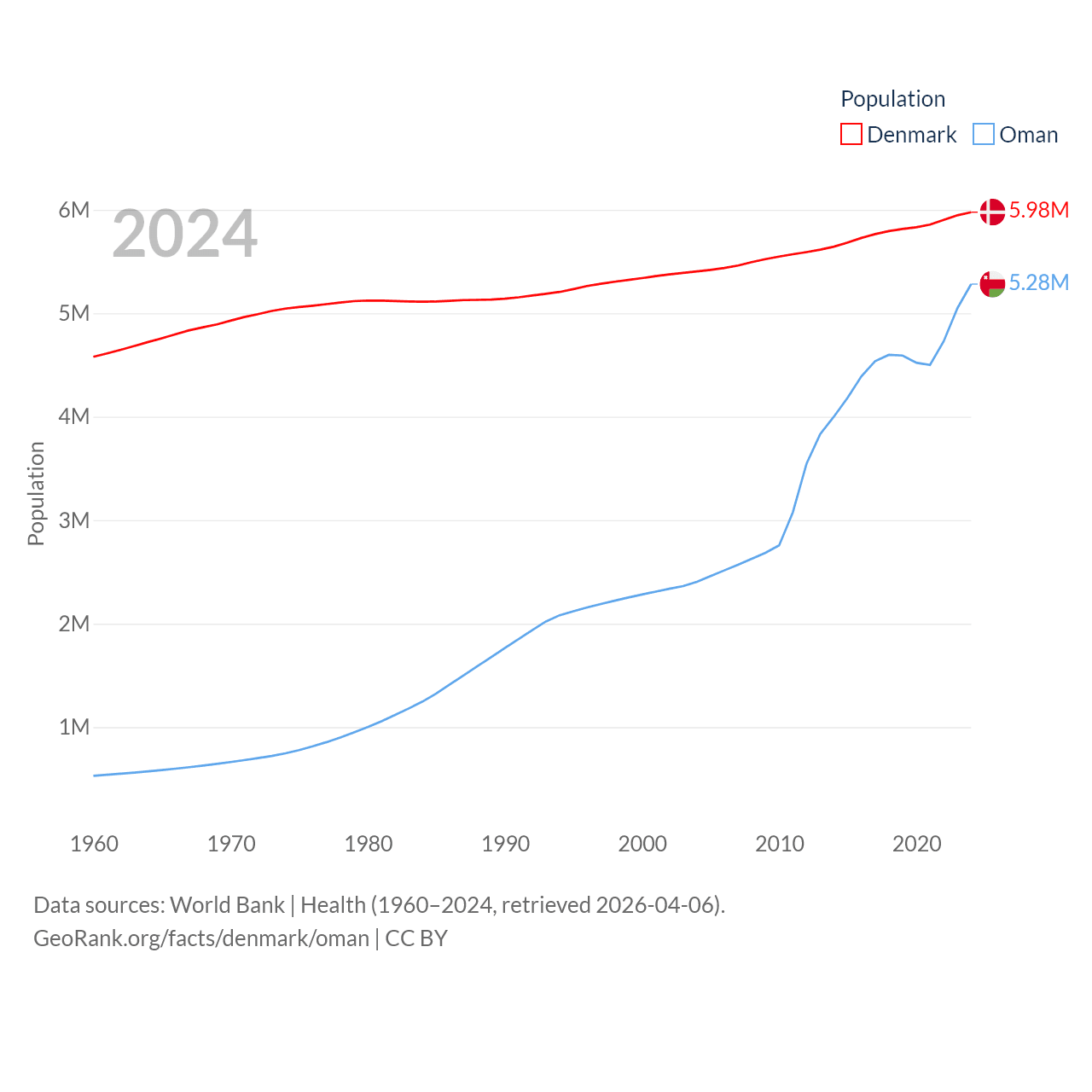 Denmark has a population of 5.98M (ranked 114/197), compared with 5.28M in Oman (ranked 124/197). Denmark's land area is 15,444 sq mi versus 119,499 sq mi for Oman (ranked 130th vs. 68th).