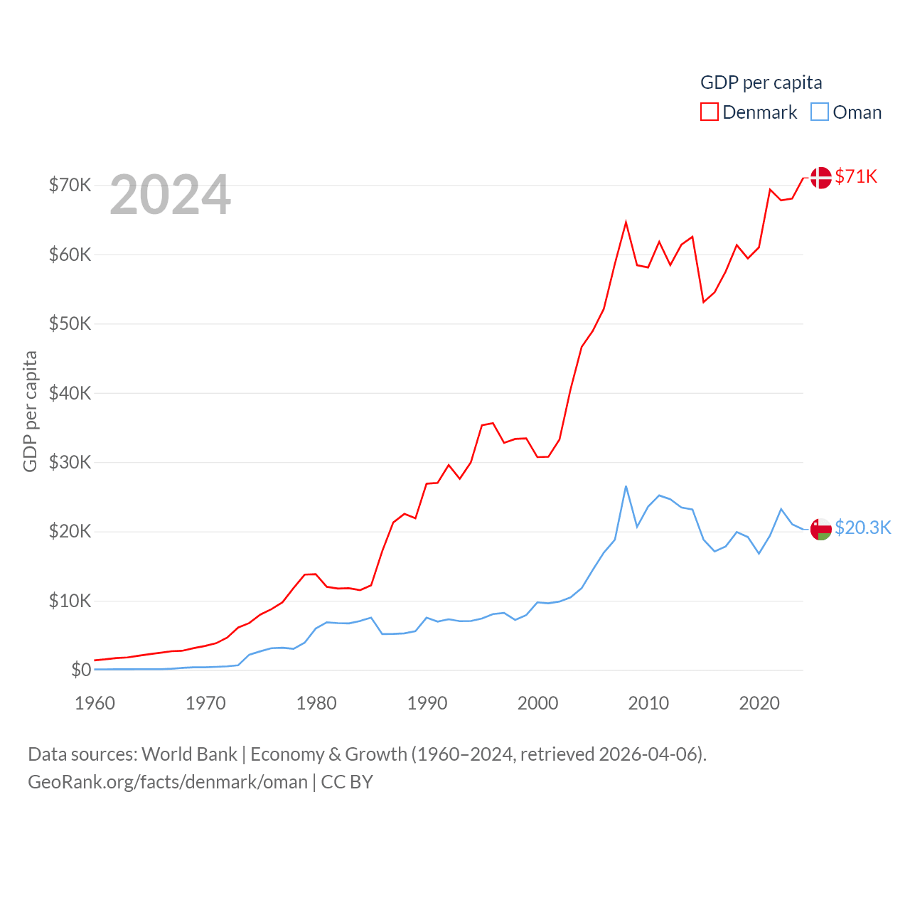 By GDP, Denmark ranks 37/197 ($425B) and Oman ranks 70/197 ($107B). By GDP per capita, Denmark ranks 12/197 ($71,026), while Oman ranks 57/197 ($20,285).