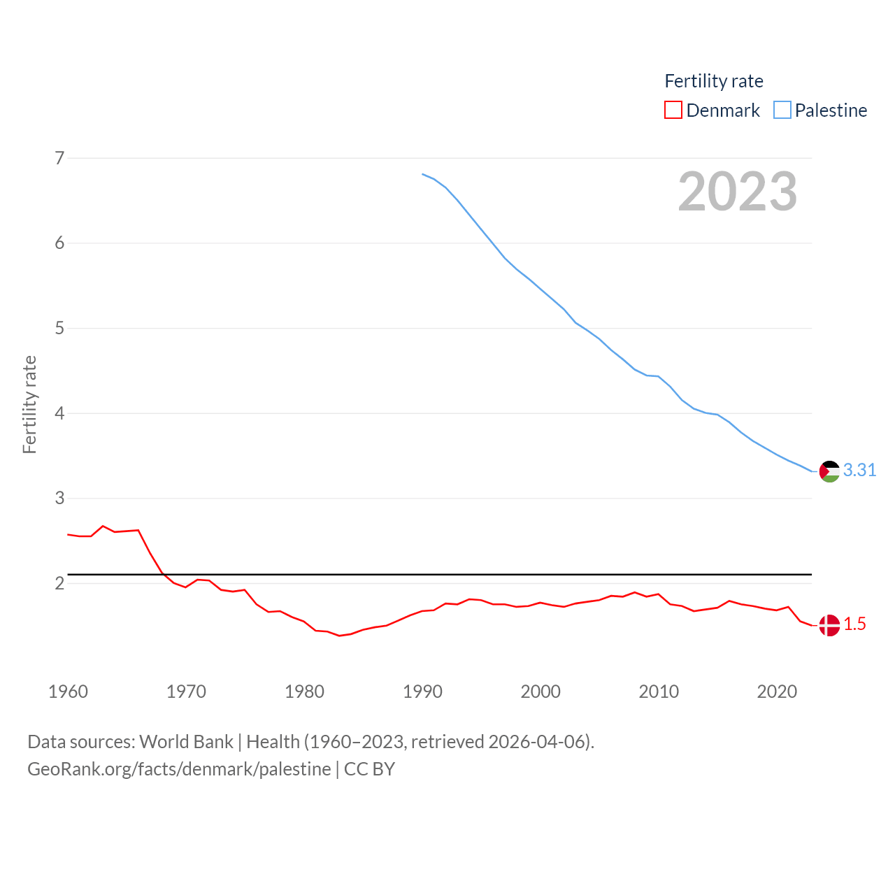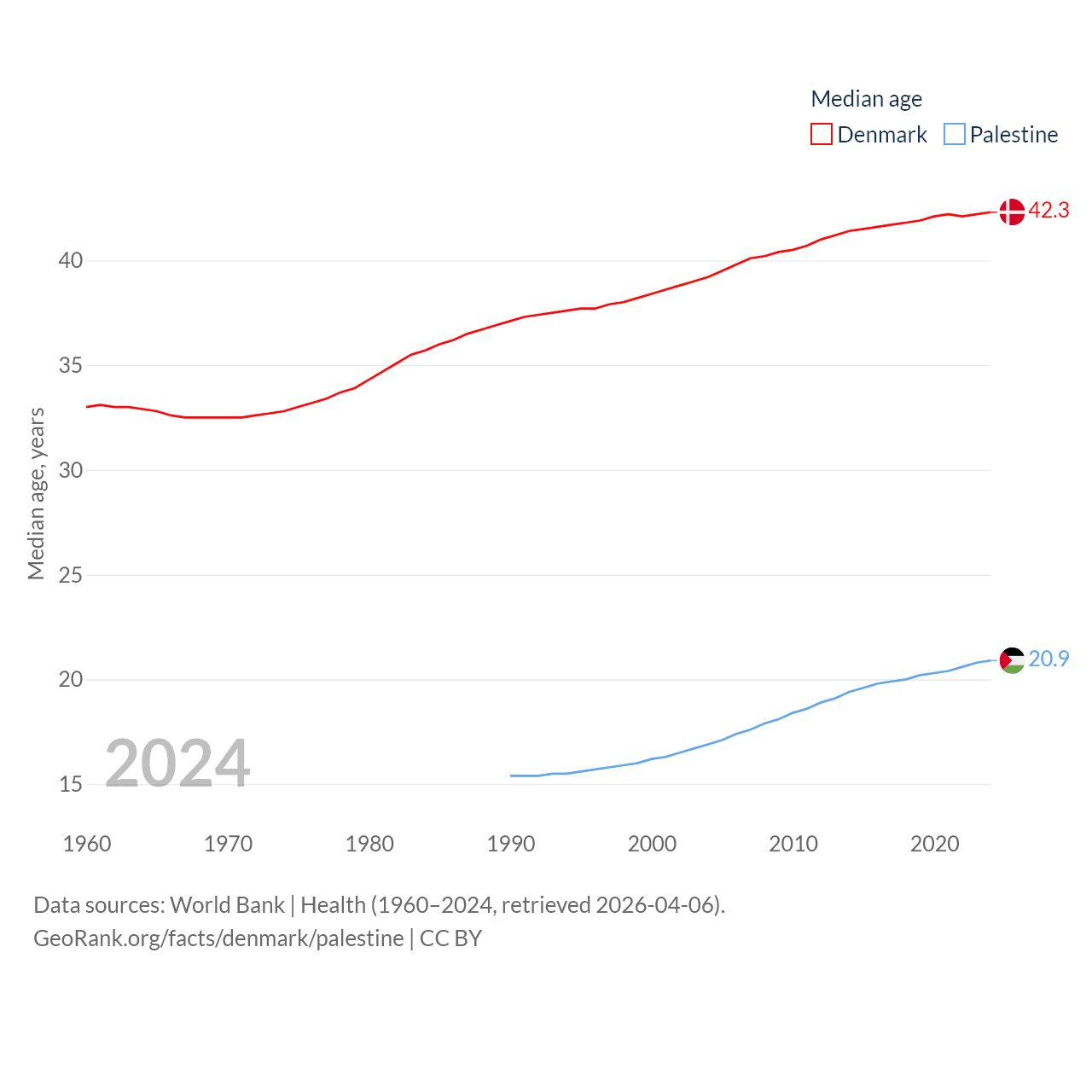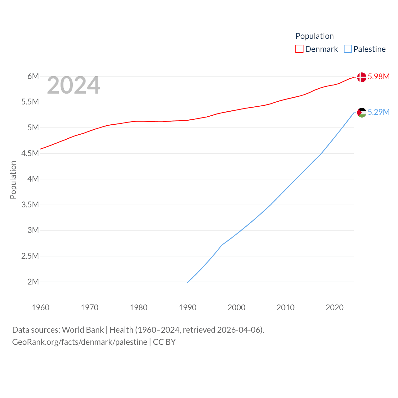 Denmark has a population of 5.98M (ranked 114/197), compared with 5.29M in Palestine (ranked 122/197). Denmark's land area is 15,444 sq mi versus 2,326 sq mi for Palestine (ranked 130th vs. 164th).