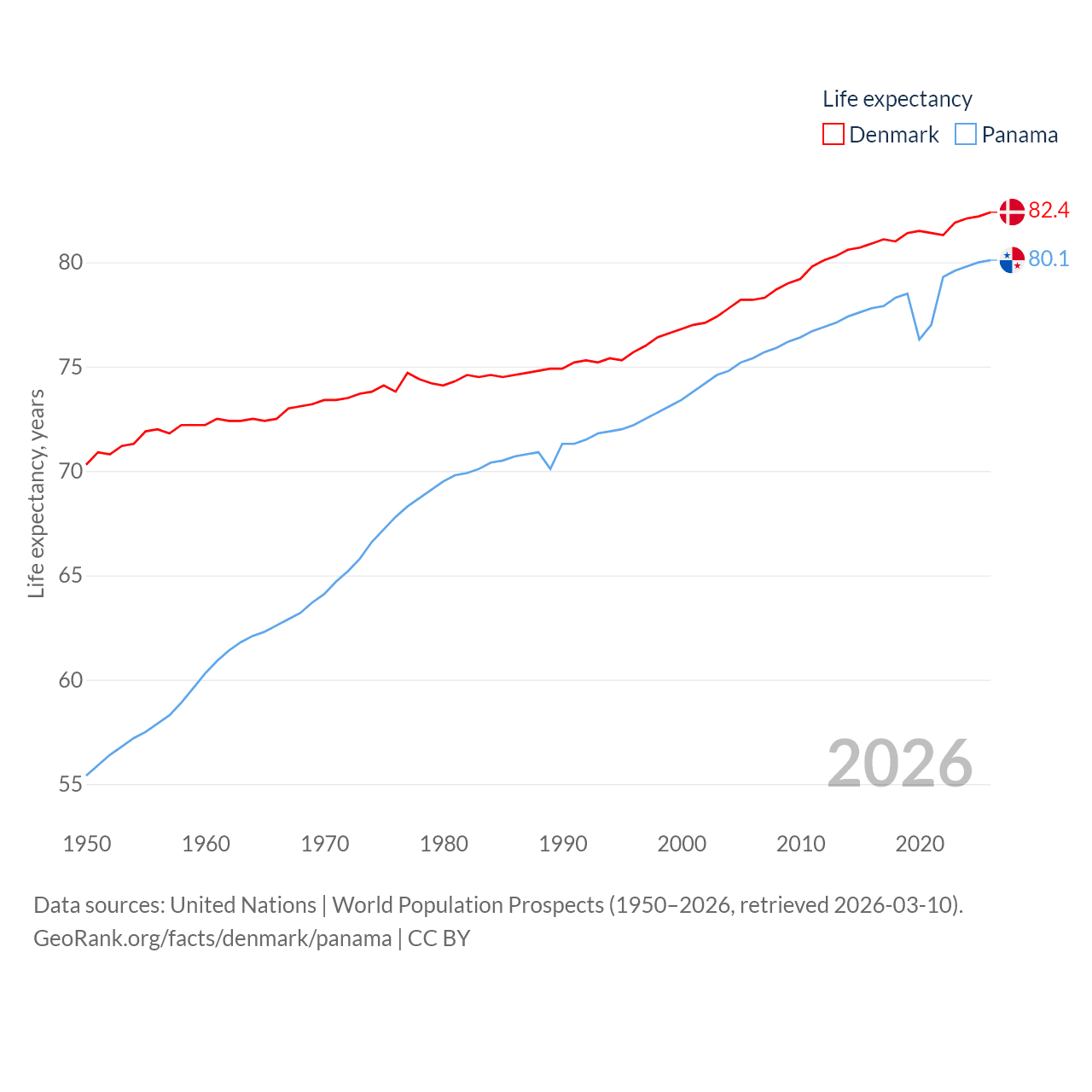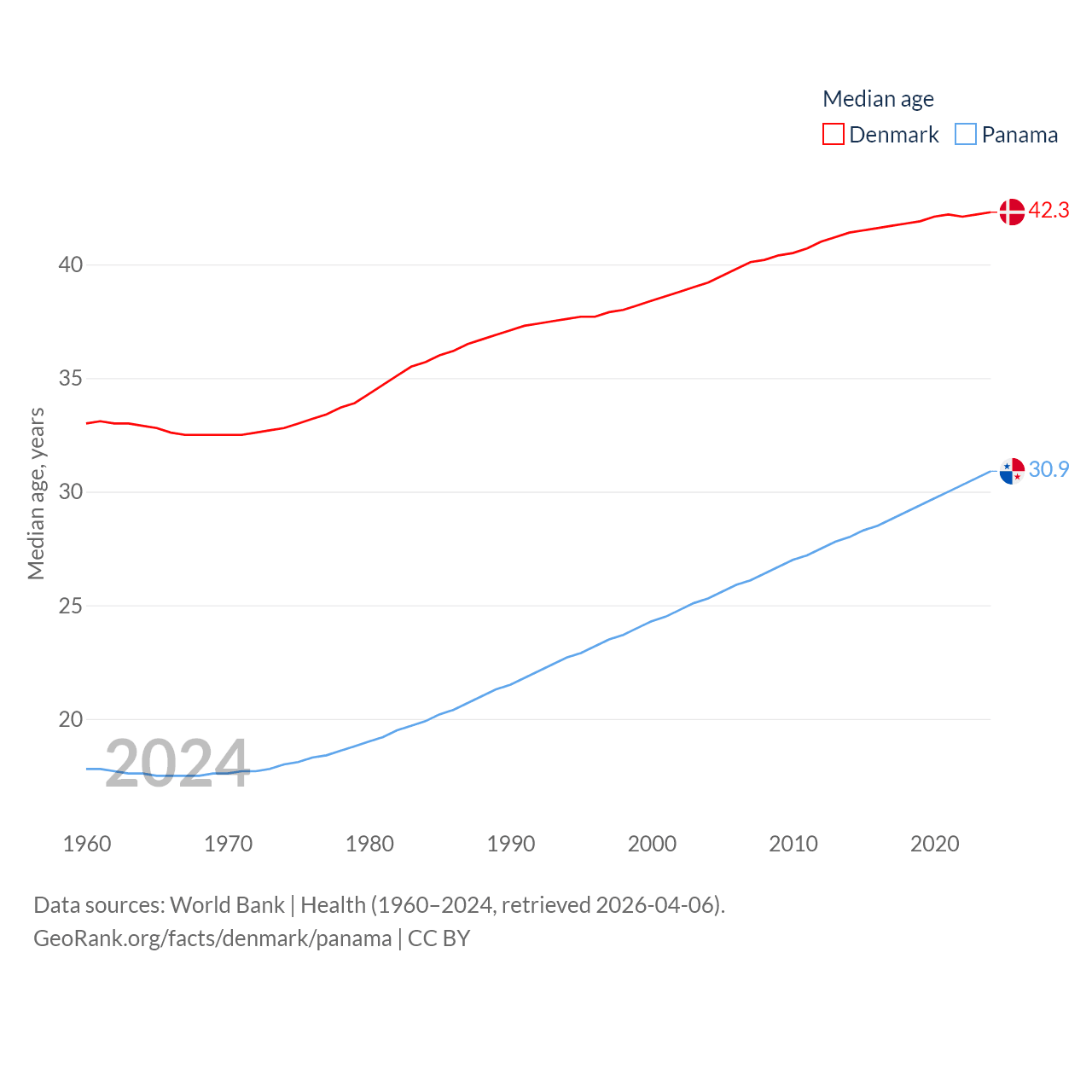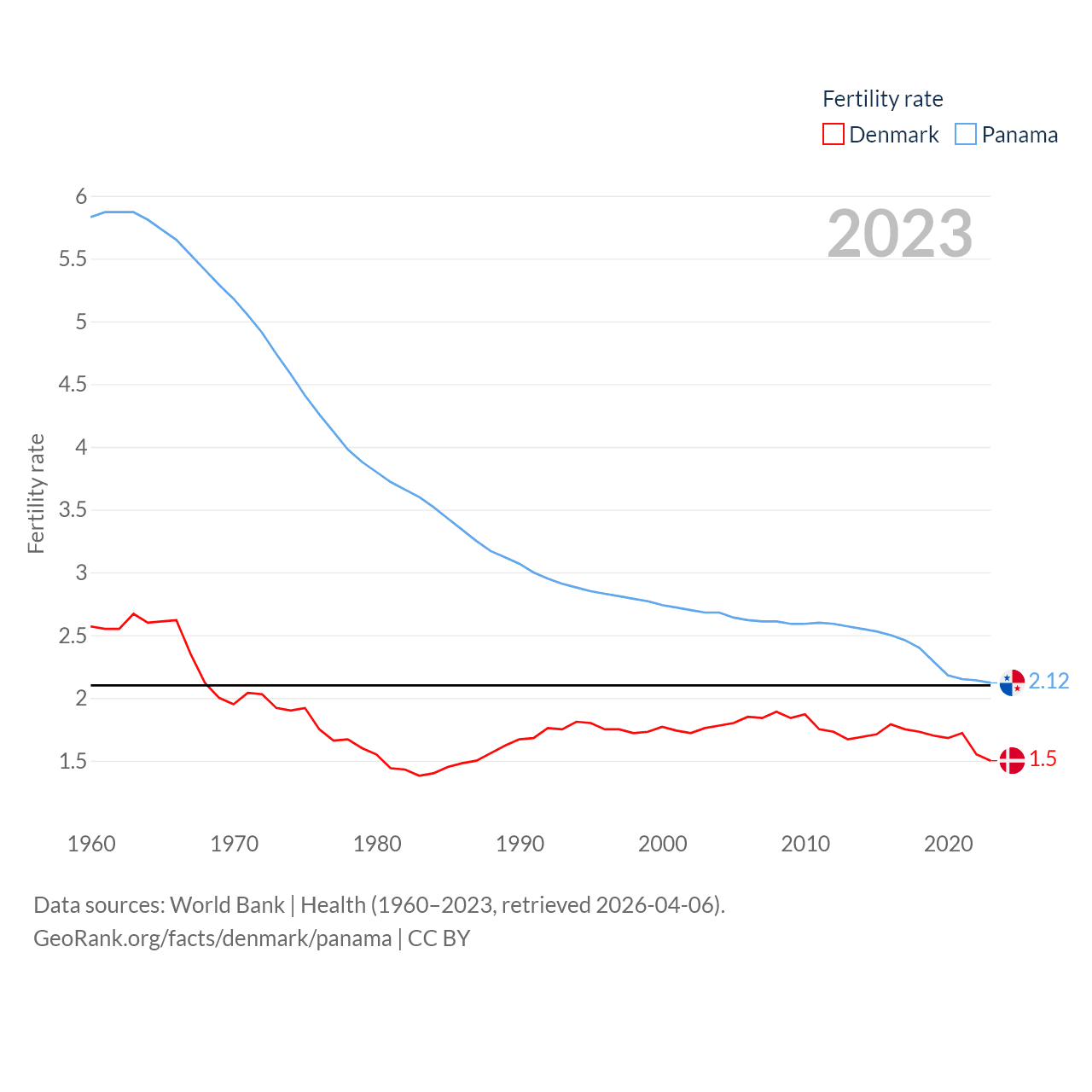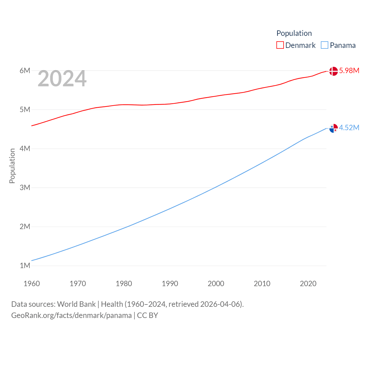Denmark has a population of 5.98M (ranked 114/197), compared with 4.52M in Panama (ranked 128/197). Denmark's land area is 15,444 sq mi versus 28,641 sq mi for Panama (ranked 130th vs. 115th).
