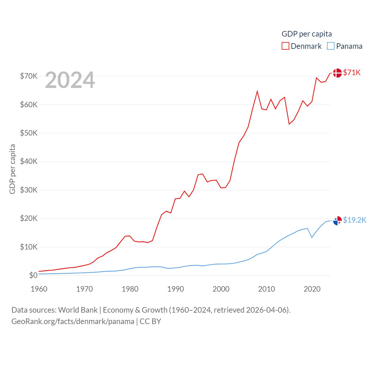 By GDP, Denmark ranks 37/197 ($425B) and Panama ranks 78/197 ($86.5B). By GDP per capita, Denmark ranks 12/197 ($71,026), while Panama ranks 60/197 ($19,161).