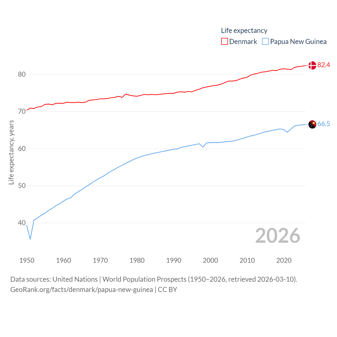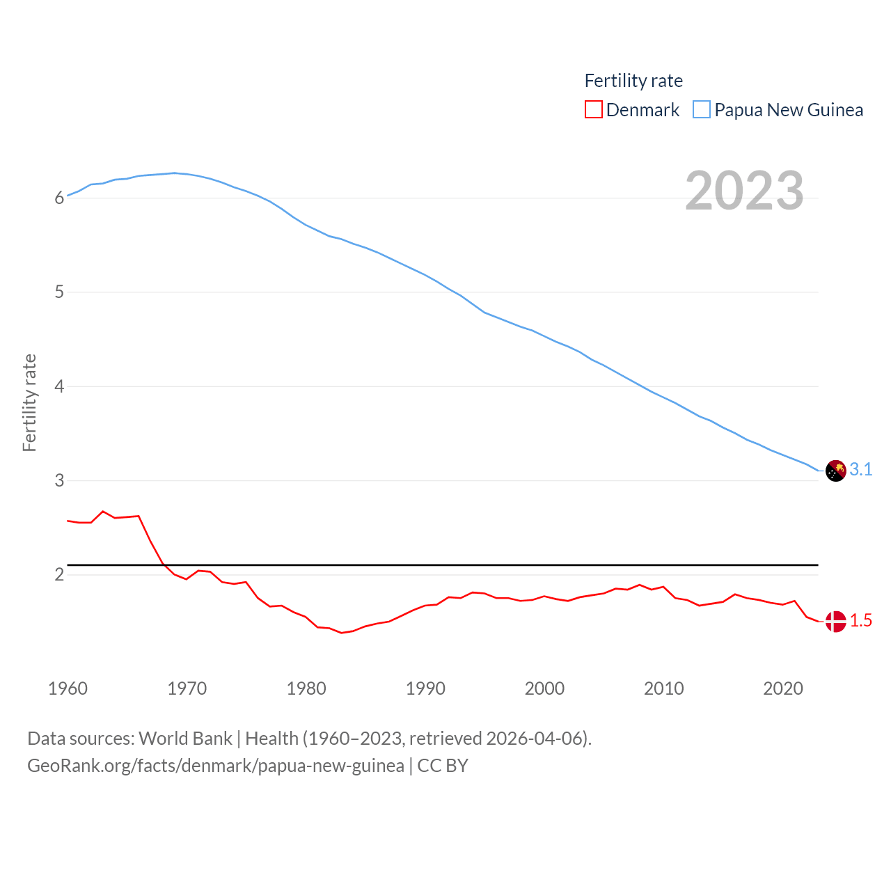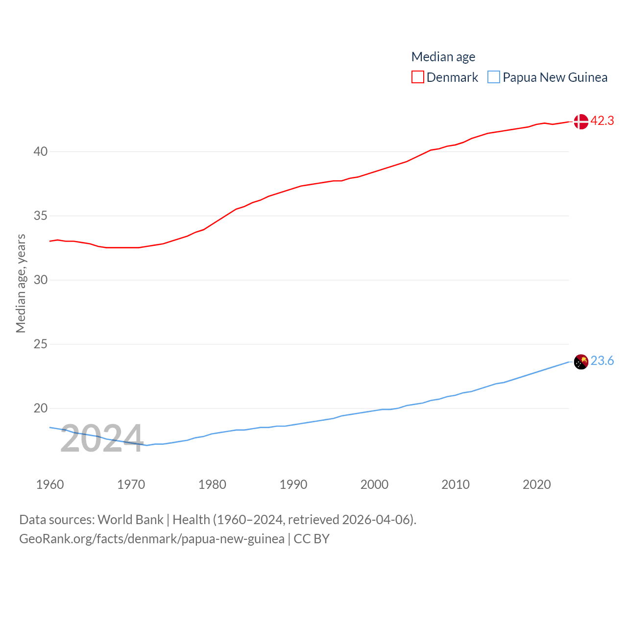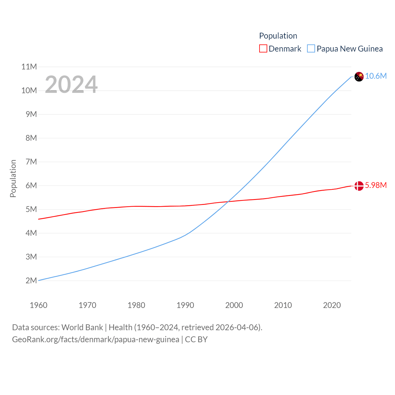 Denmark has a population of 5.98M (ranked 114/197), compared with 10.6M in Papua New Guinea (ranked 92/197). Denmark's land area is 15,444 sq mi versus 174,850 sq mi for Papua New Guinea (ranked 130th vs. 54th).