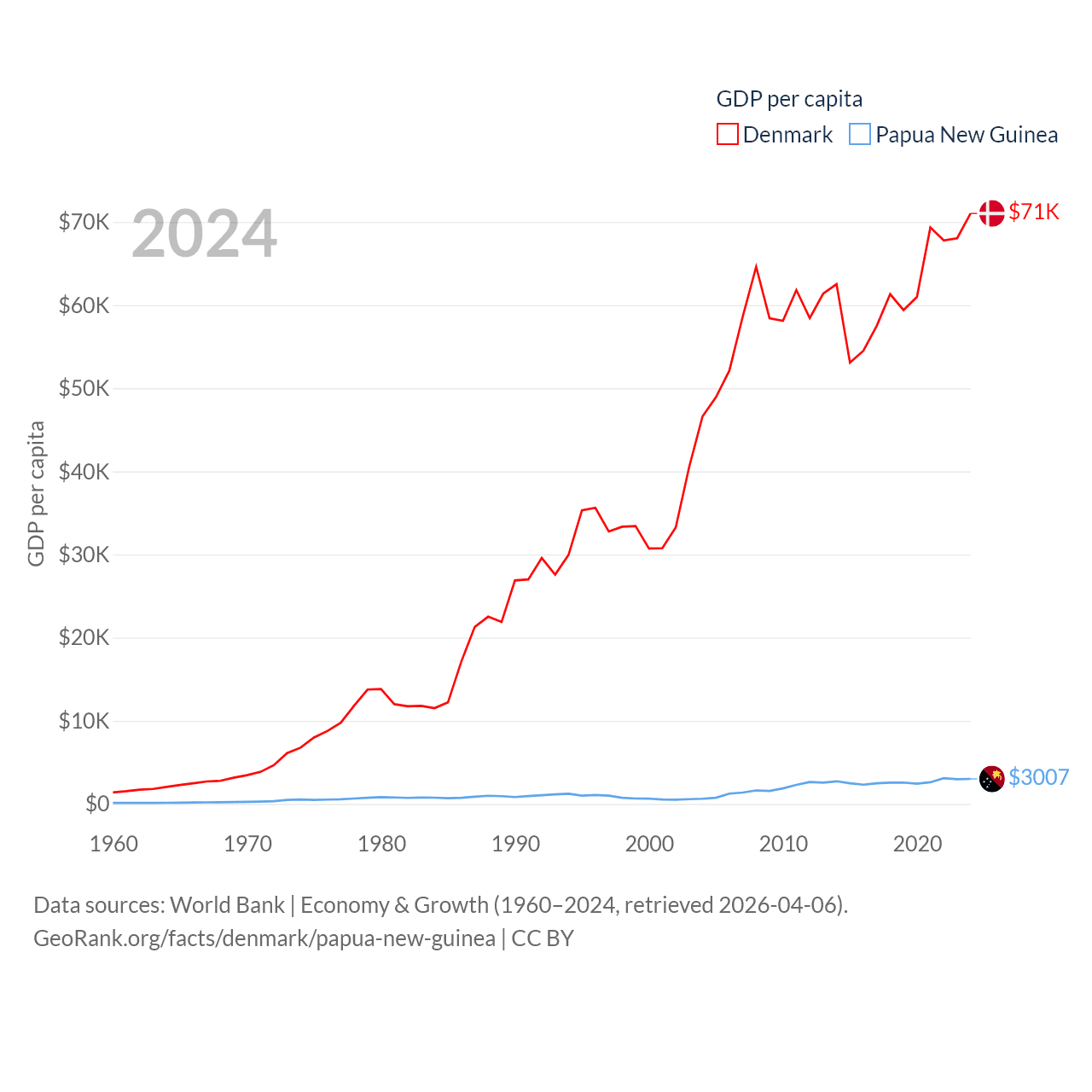 By GDP, Denmark ranks 37/197 ($425B) and Papua New Guinea ranks 110/197 ($31.8B). By GDP per capita, Denmark ranks 12/197 ($71,026), while Papua New Guinea ranks 140/197 ($3,007).
