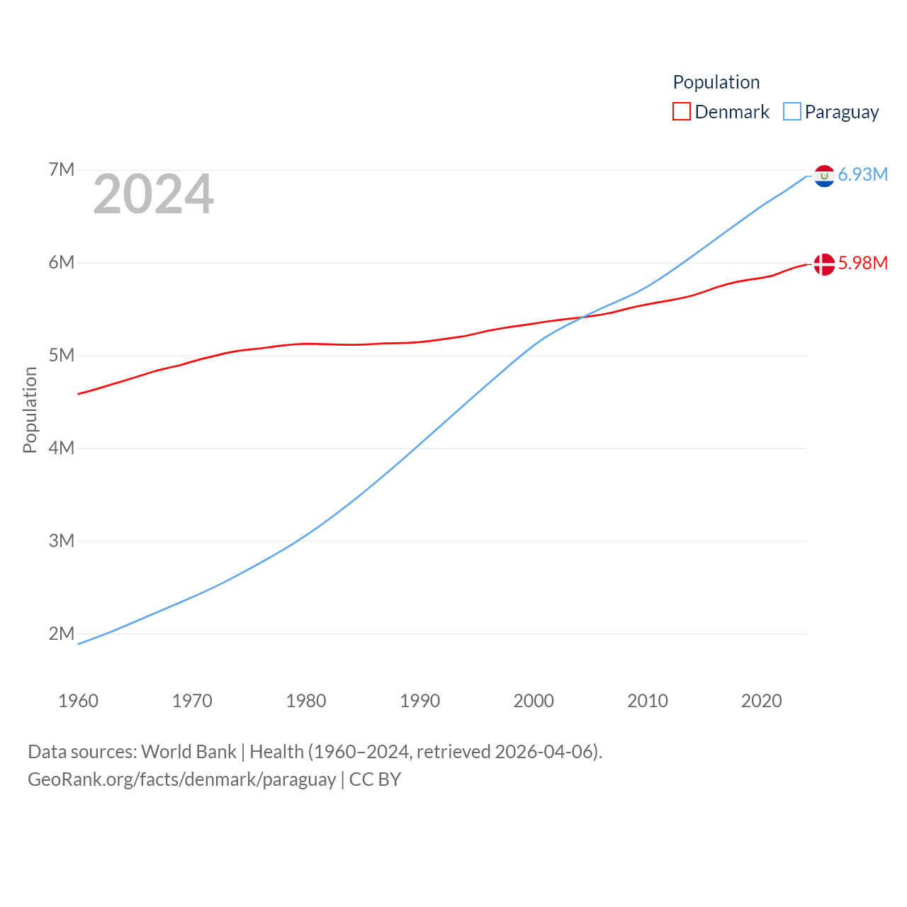 Denmark has a population of 5.98M (ranked 114/197), compared with 6.93M in Paraguay (ranked 107/197). Denmark's land area is 15,444 sq mi versus 152,901 sq mi for Paraguay (ranked 130th vs. 59th).