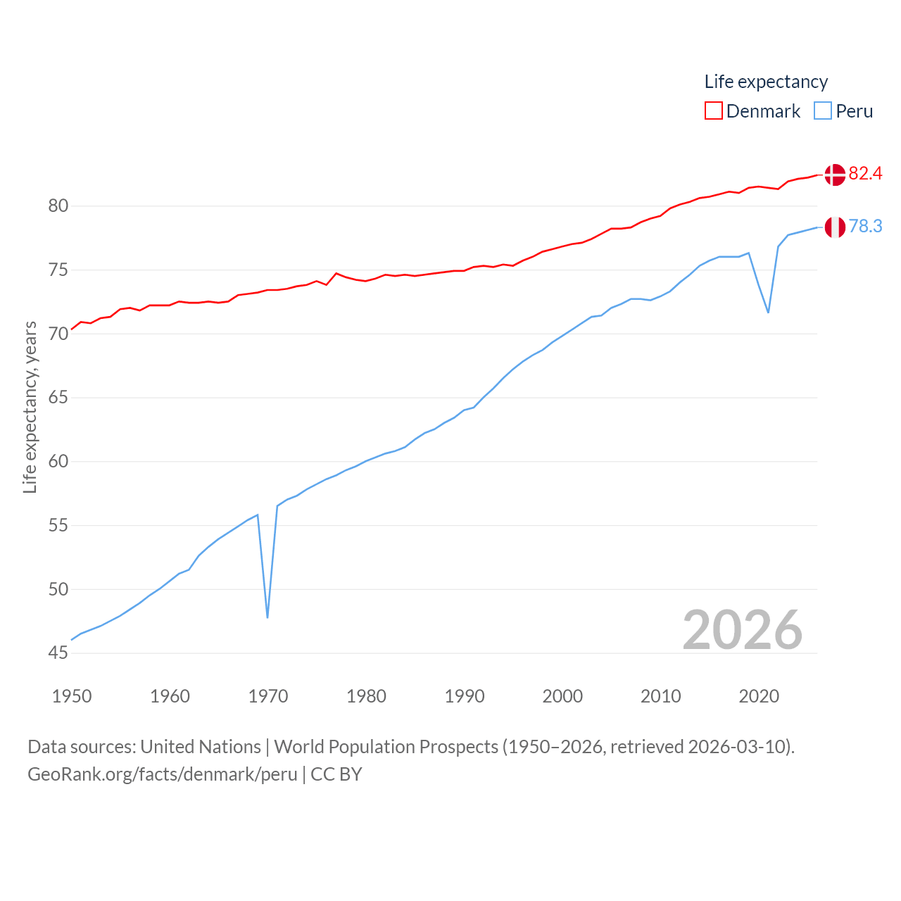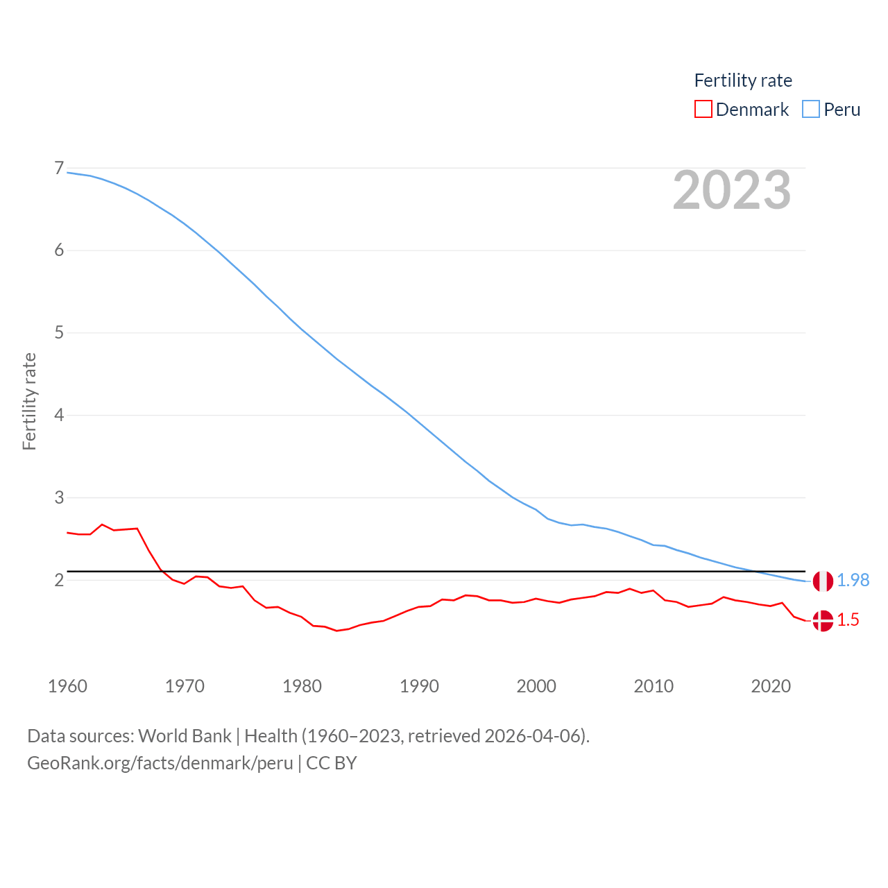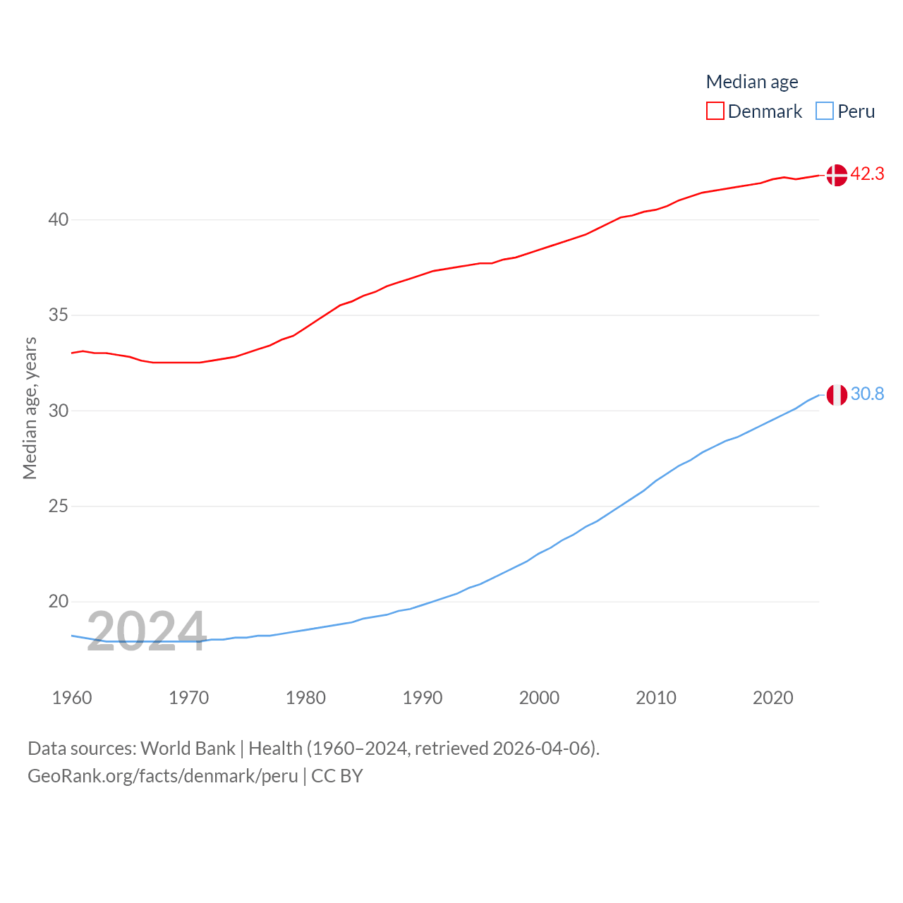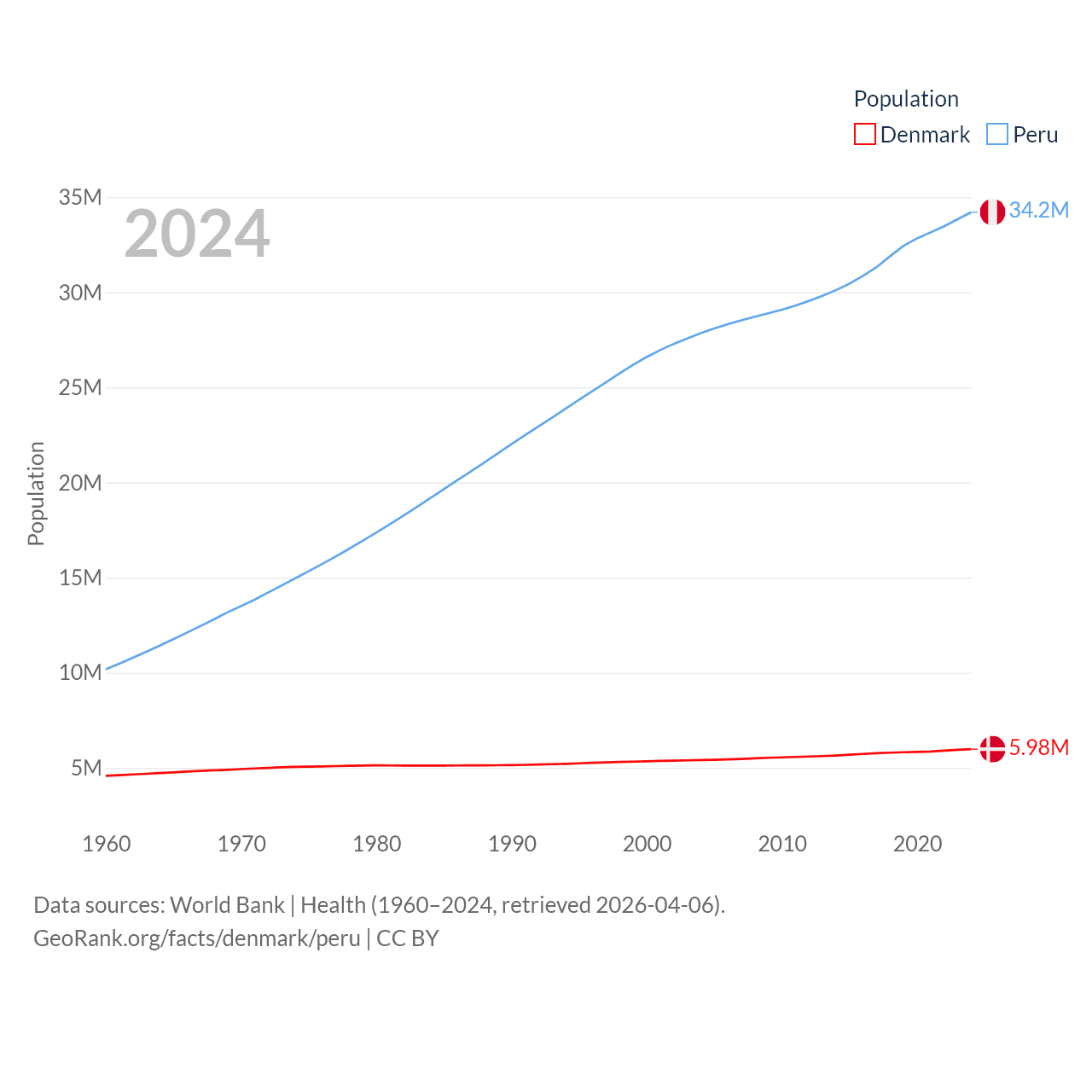 Denmark has a population of 5.98M (ranked 114/197), compared with 34.2M in Peru (ranked 48/197). Denmark's land area is 15,444 sq mi versus 494,211 sq mi for Peru (ranked 130th vs. 19th).