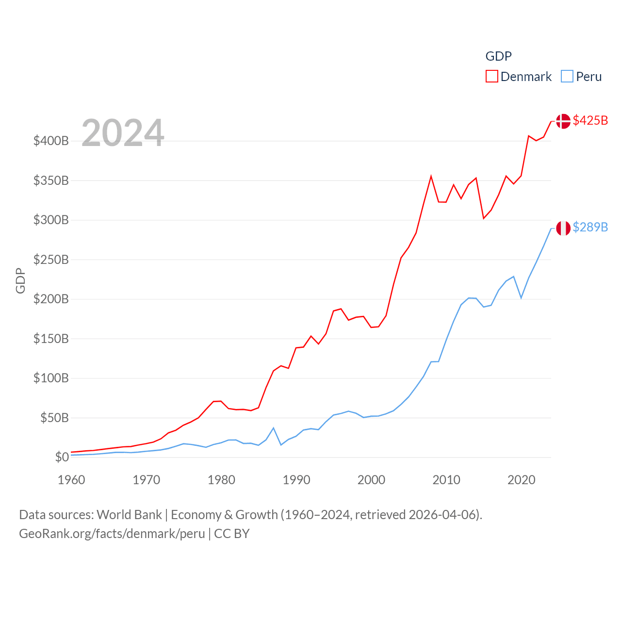 By GDP, Denmark ranks 37/197 ($425B) and Peru ranks 49/197 ($289B). By GDP per capita, Denmark ranks 12/197 ($71,026), while Peru ranks 91/197 ($8,452).
