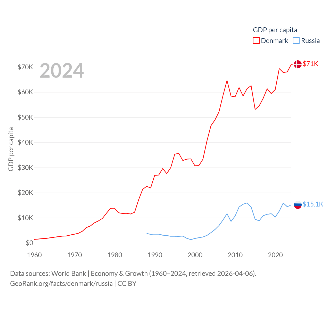 By GDP, Denmark ranks 37/197 ($425B) and Russia ranks 11/197 ($2.17T). By GDP per capita, Denmark ranks 12/197 ($71,026), while Russia ranks 68/197 ($15,145).