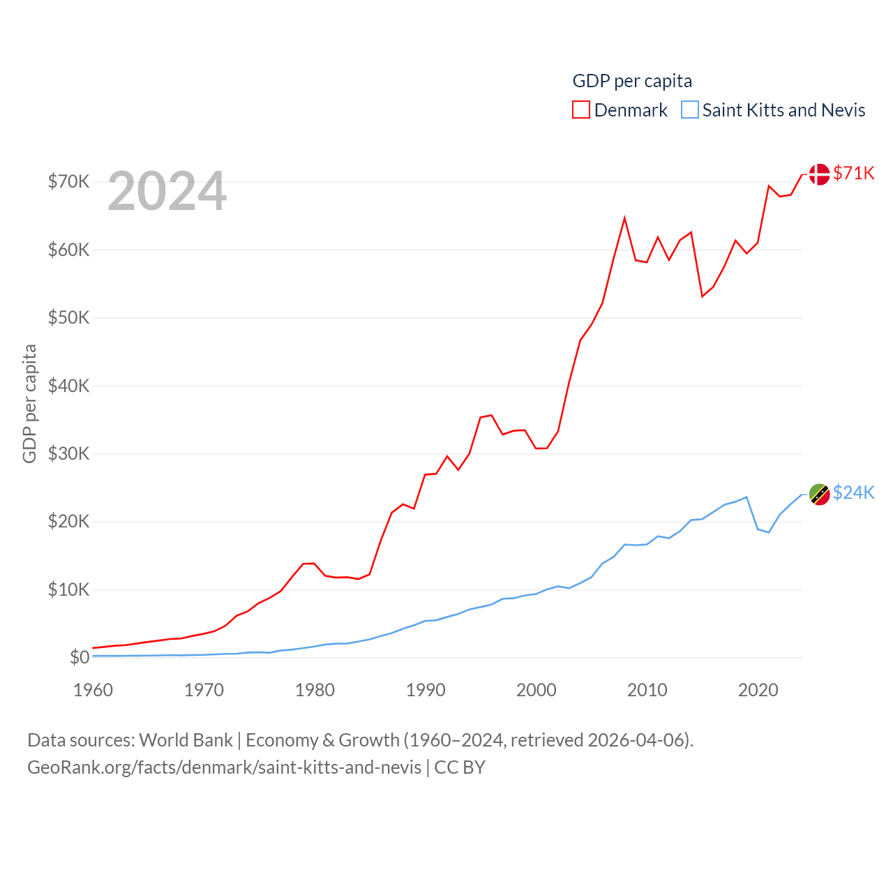 By GDP, Denmark ranks 37/197 ($425B) and Saint Kitts and Nevis ranks 187/197 ($1.12B). By GDP per capita, Denmark ranks 12/197 ($71,026), while Saint Kitts and Nevis ranks 51/197 ($23,961).