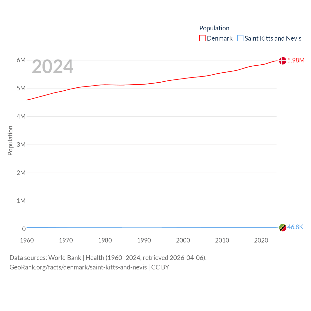 Denmark has a population of 5.98M (ranked 114/197), compared with 46.8K in Saint Kitts and Nevis (ranked 189/197). Denmark's land area is 15,444 sq mi versus 100.4 sq mi for Saint Kitts and Nevis (ranked 130th vs. 189th).