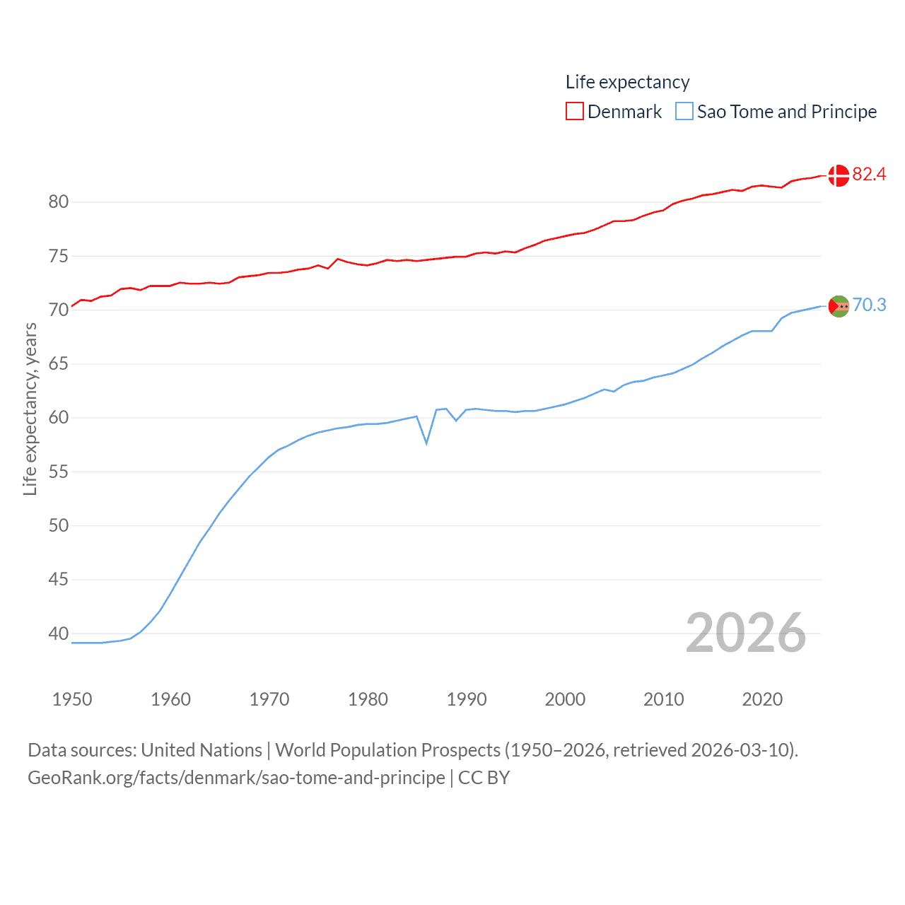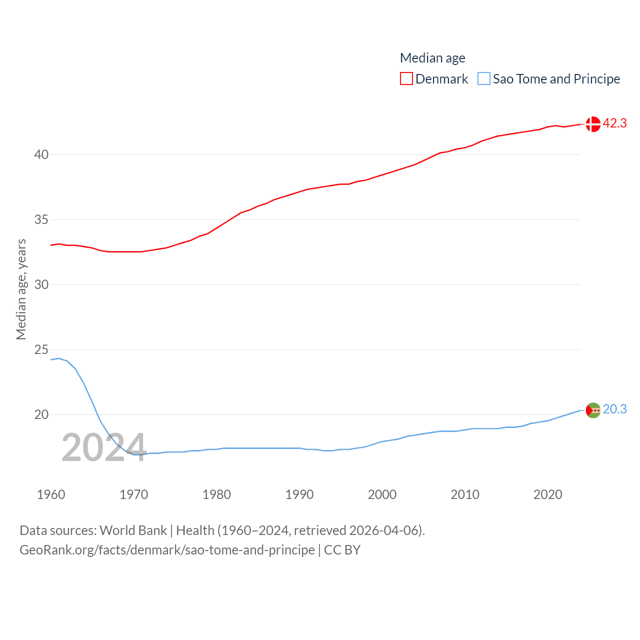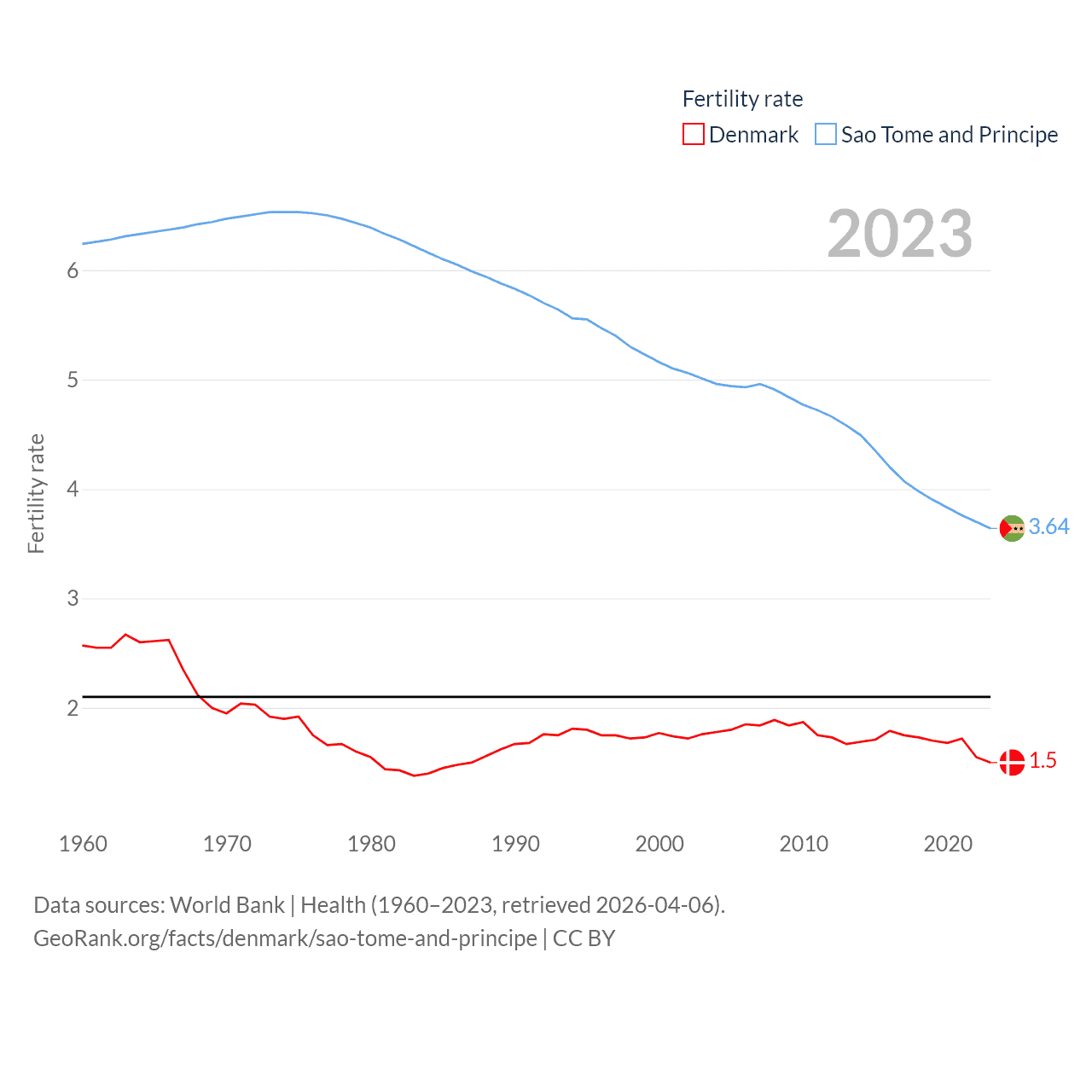 Denmark has a population of 5.98M (ranked 114/197), compared with 236K in Sao Tome and Principe (ranked 176/197). Denmark's land area is 15,444 sq mi versus 371 sq mi for Sao Tome and Principe (ranked 130th vs. 172nd).
