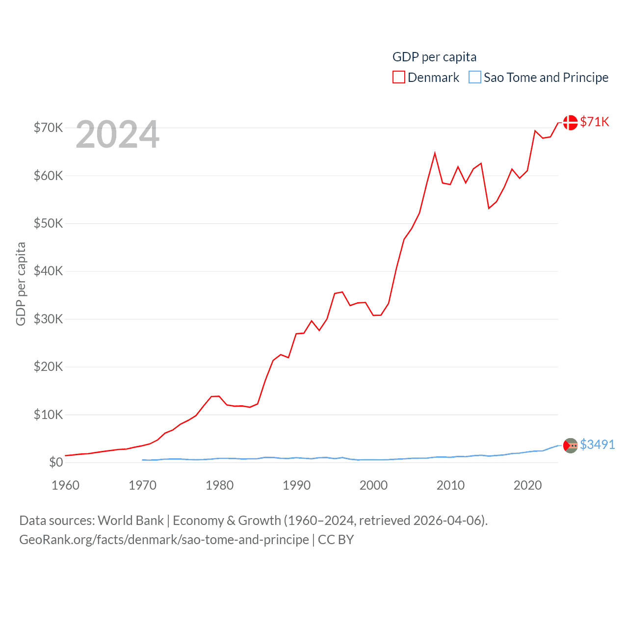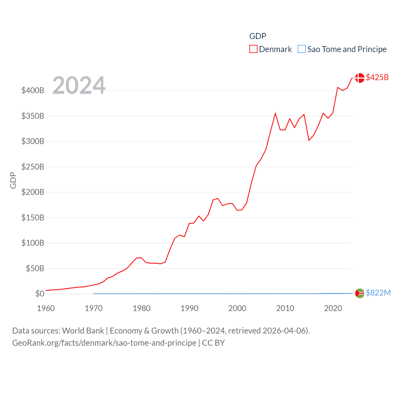 By GDP, Denmark ranks 37/197 ($425B) and Sao Tome and Principe ranks 189/197 ($822M). By GDP per capita, Denmark ranks 12/197 ($71,026), while Sao Tome and Principe ranks 134/197 ($3,491).