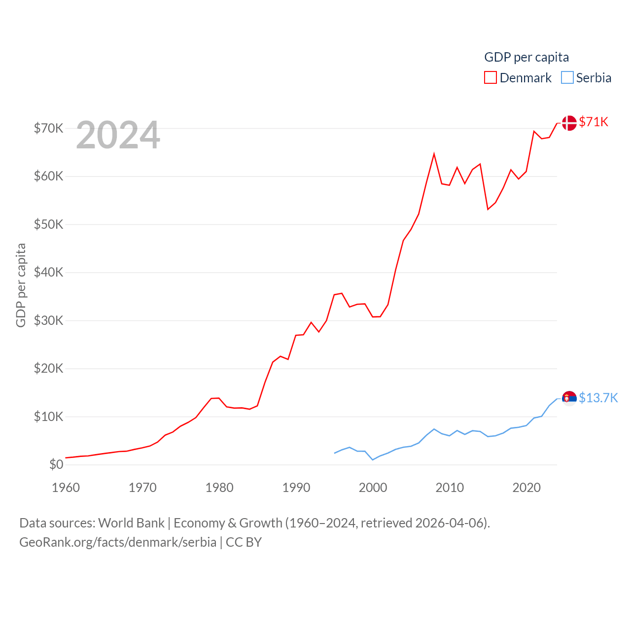 By GDP, Denmark ranks 37/197 ($425B) and Serbia ranks 76/197 ($90.1B). By GDP per capita, Denmark ranks 12/197 ($71,026), while Serbia ranks 73/197 ($13,679).
