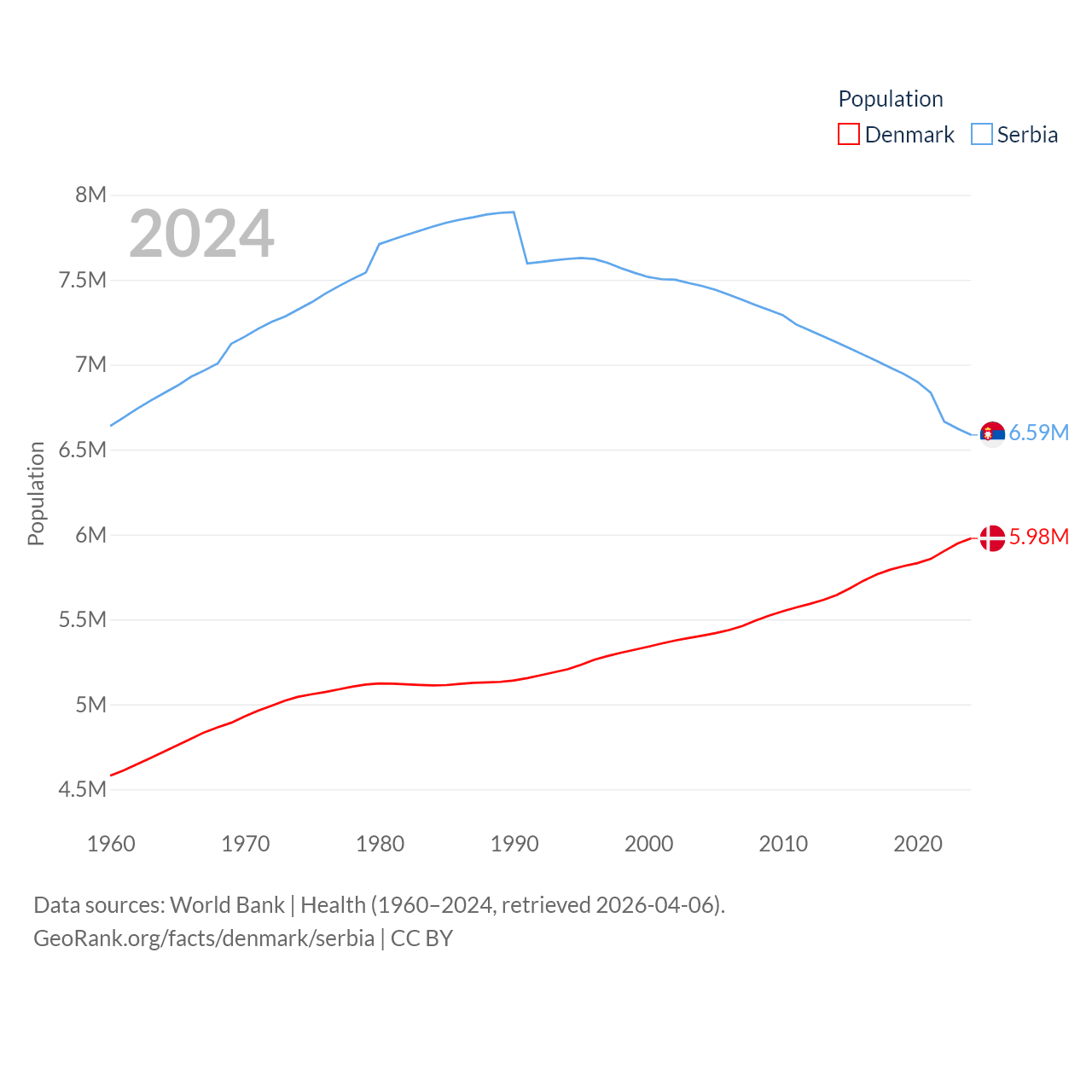 Denmark has a population of 5.98M (ranked 114/197), compared with 6.59M in Serbia (ranked 109/197). Denmark's land area is 15,444 sq mi versus 32,467 sq mi for Serbia (ranked 130th vs. 111th).