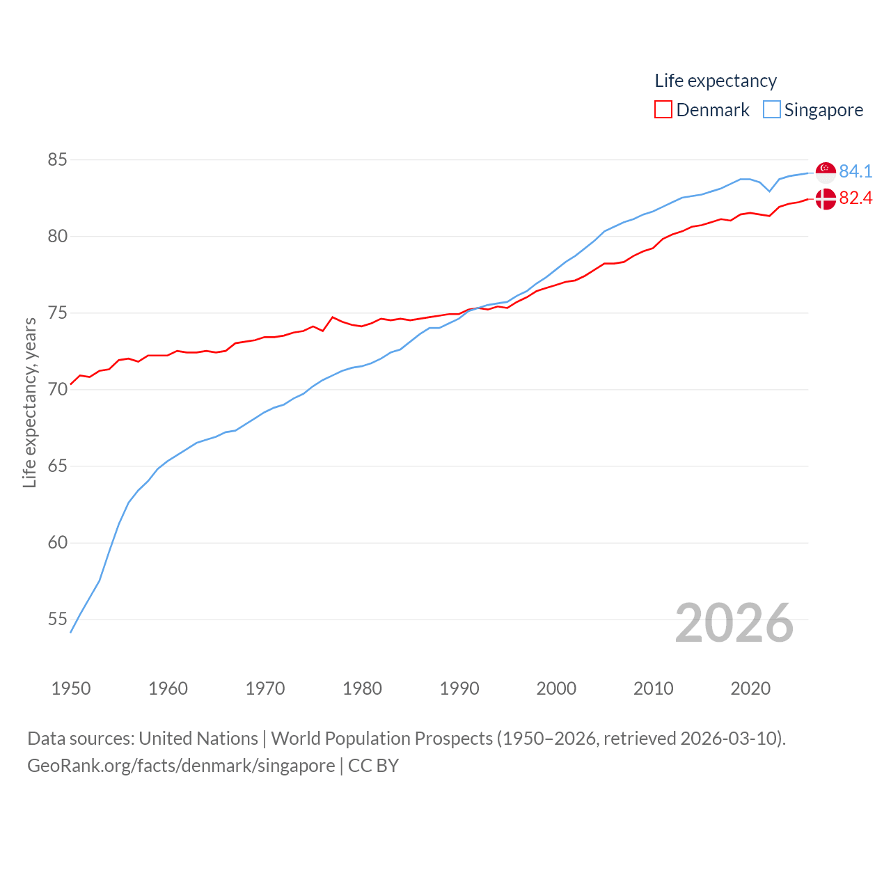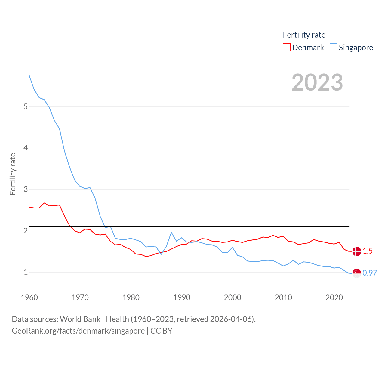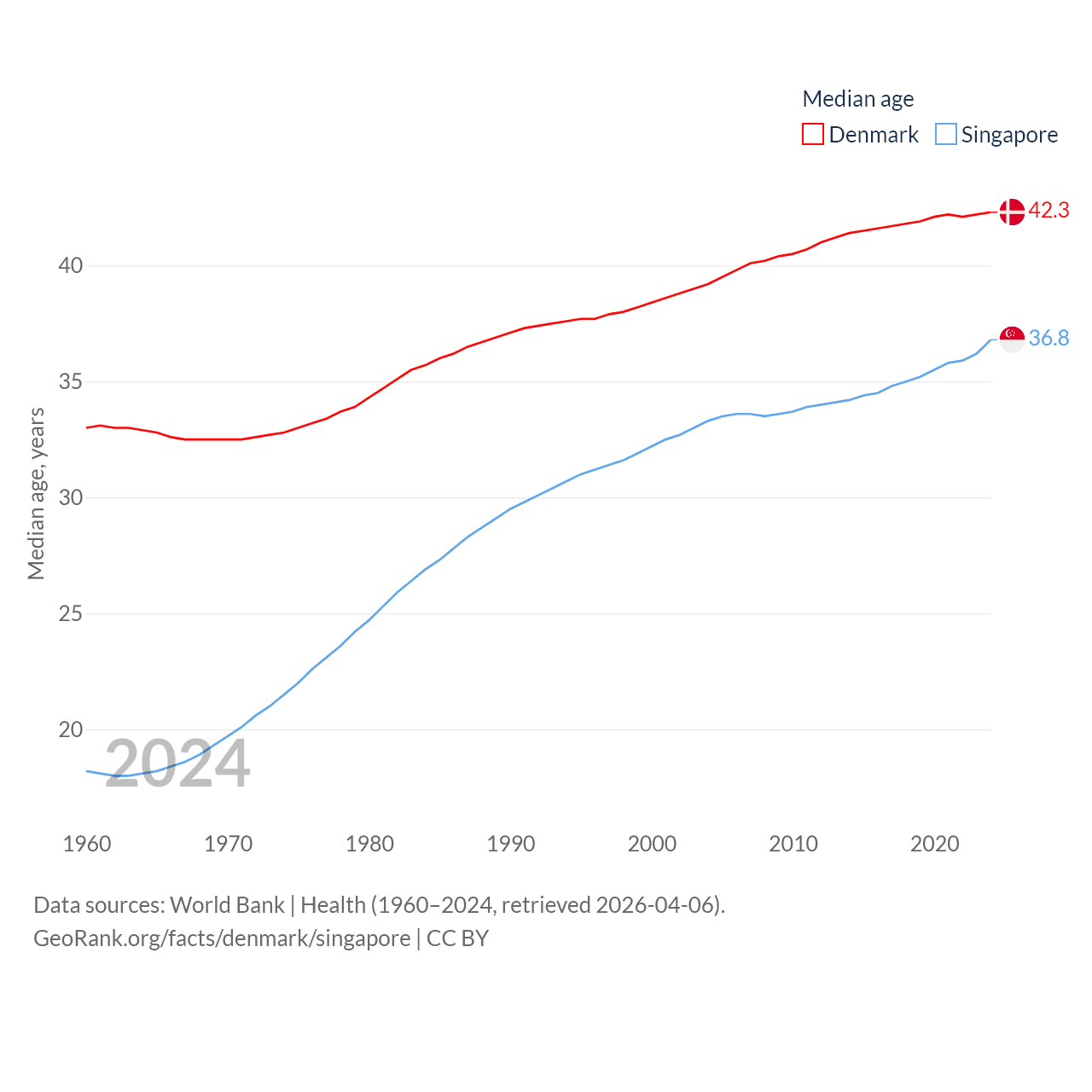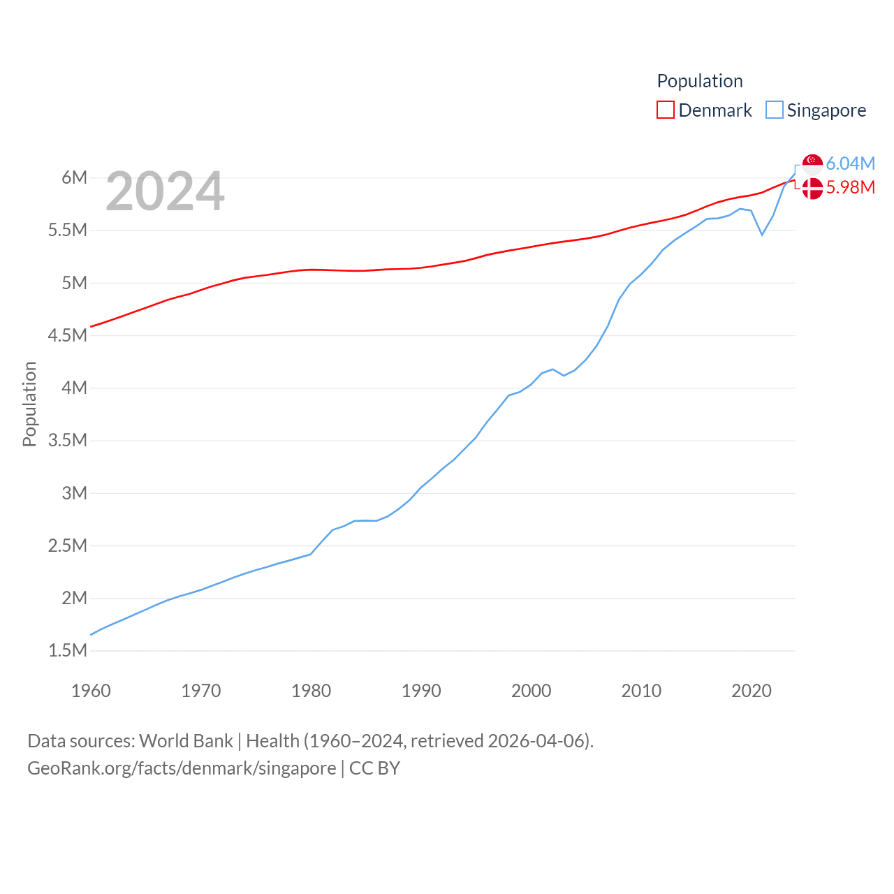 Denmark has a population of 5.98M (ranked 114/197), compared with 6.04M in Singapore (ranked 113/197). Denmark's land area is 15,444 sq mi versus 277.2 sq mi for Singapore (ranked 130th vs. 177th).