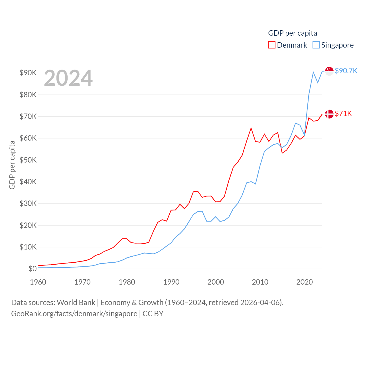 By GDP, Denmark ranks 37/197 ($425B) and Singapore ranks 28/197 ($547B). By GDP per capita, Denmark ranks 12/197 ($71,026), while Singapore ranks 7/197 ($90,674).