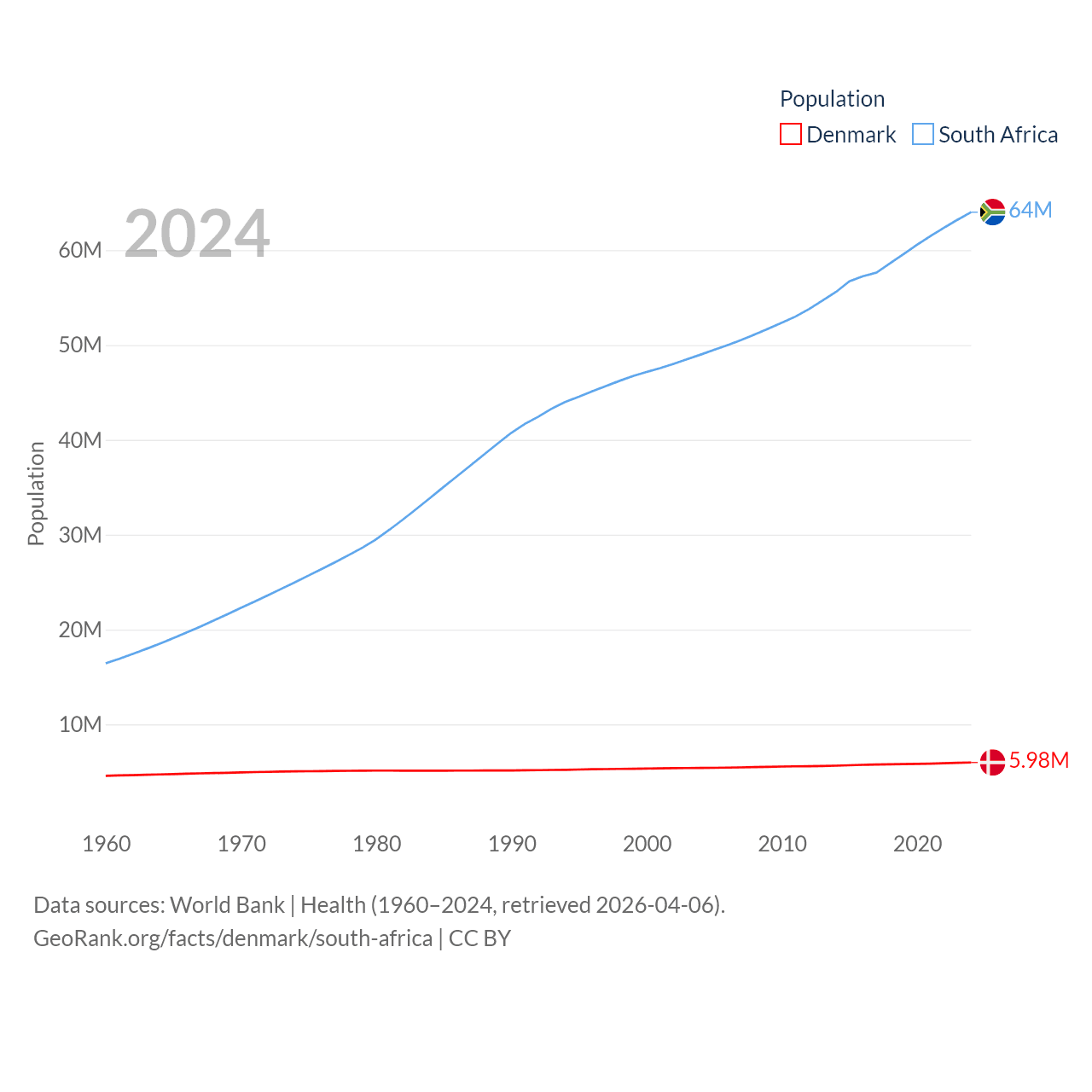 Denmark has a population of 5.98M (ranked 114/197), compared with 64M in South Africa (ranked 24/197). Denmark's land area is 15,444 sq mi versus 468,377 sq mi for South Africa (ranked 130th vs. 24th).