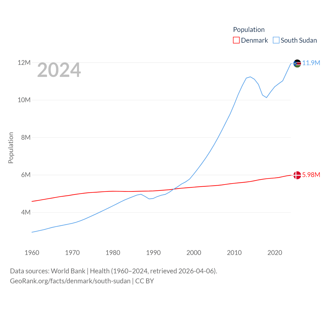 Denmark has a population of 5.98M (ranked 114/197), compared with 11.9M in South Sudan (ranked 81/197). Denmark's land area is 15,444 sq mi versus 243,990 sq mi for South Sudan (ranked 130th vs. 41st).