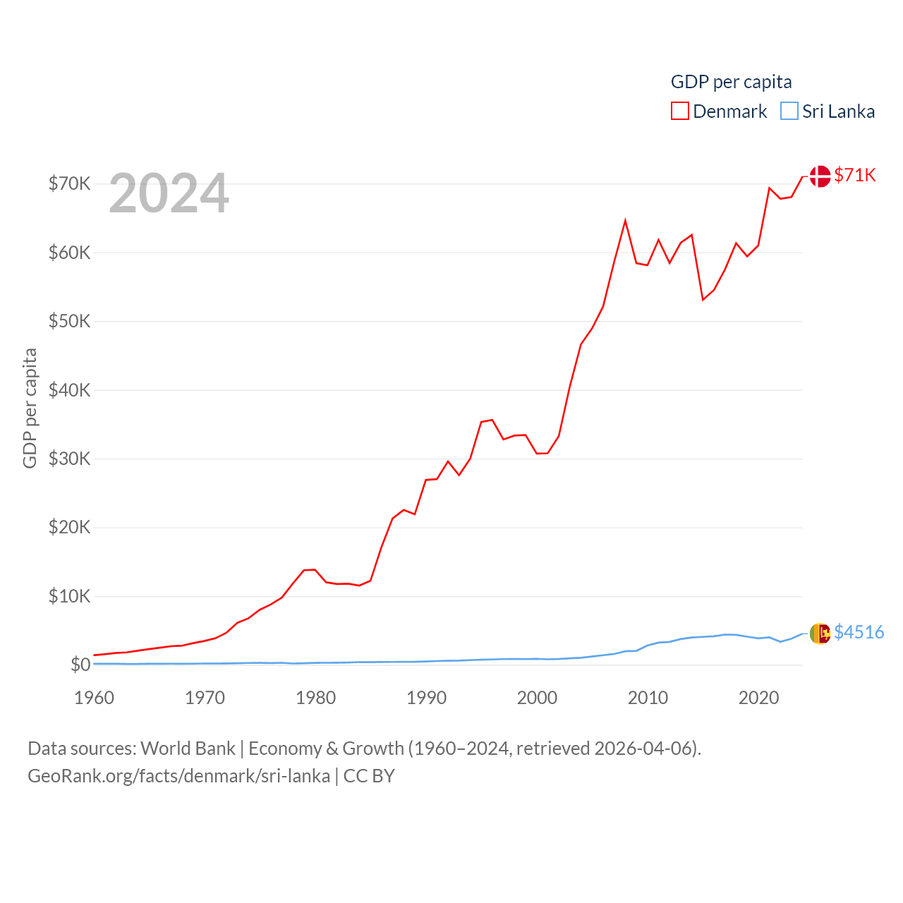 By GDP, Denmark ranks 37/197 ($425B) and Sri Lanka ranks 72/197 ($99B). By GDP per capita, Denmark ranks 12/197 ($71,026), while Sri Lanka ranks 124/197 ($4,516).