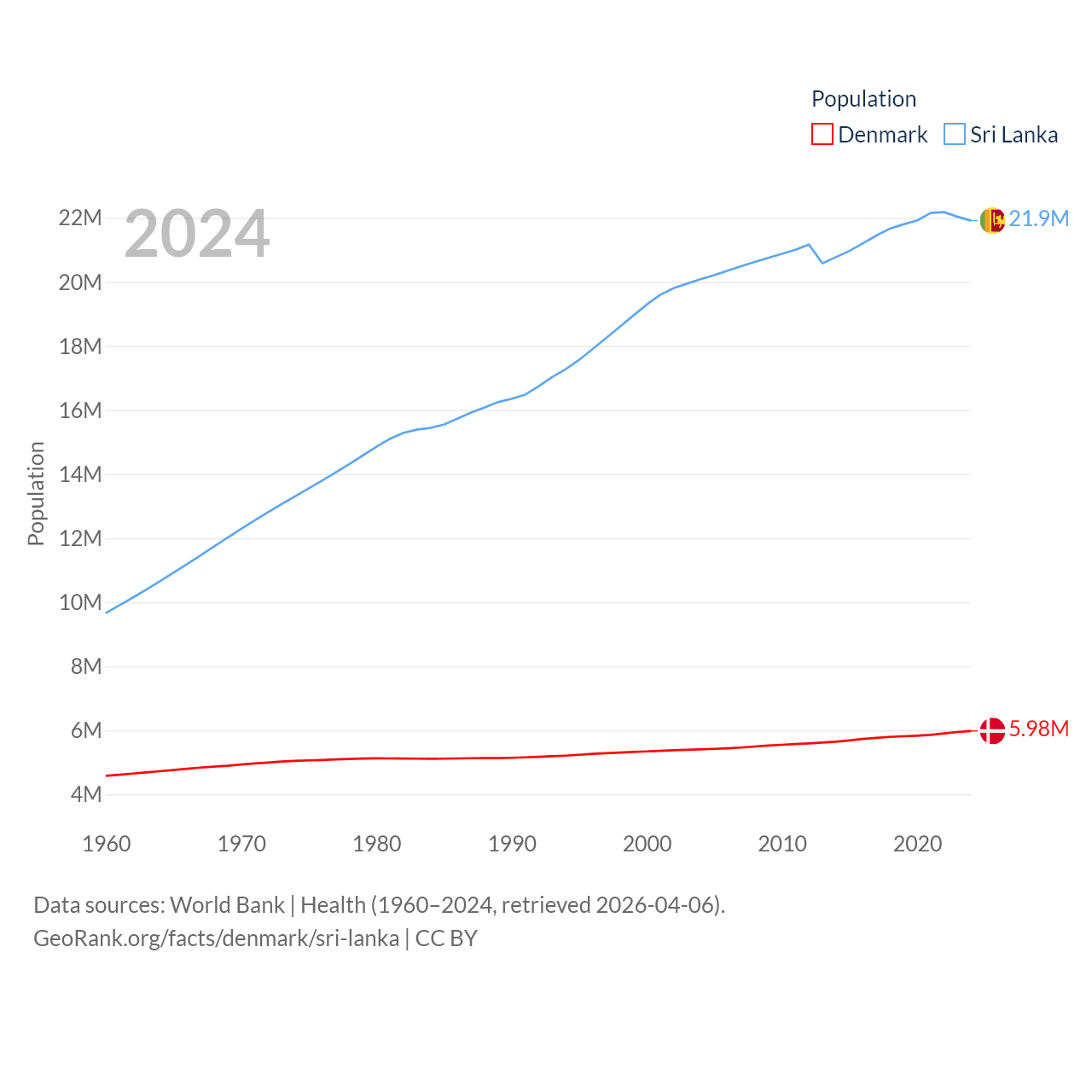 Denmark has a population of 5.98M (ranked 114/197), compared with 21.9M in Sri Lanka (ranked 61/197). Denmark's land area is 15,444 sq mi versus 23,884 sq mi for Sri Lanka (ranked 130th vs. 122nd).