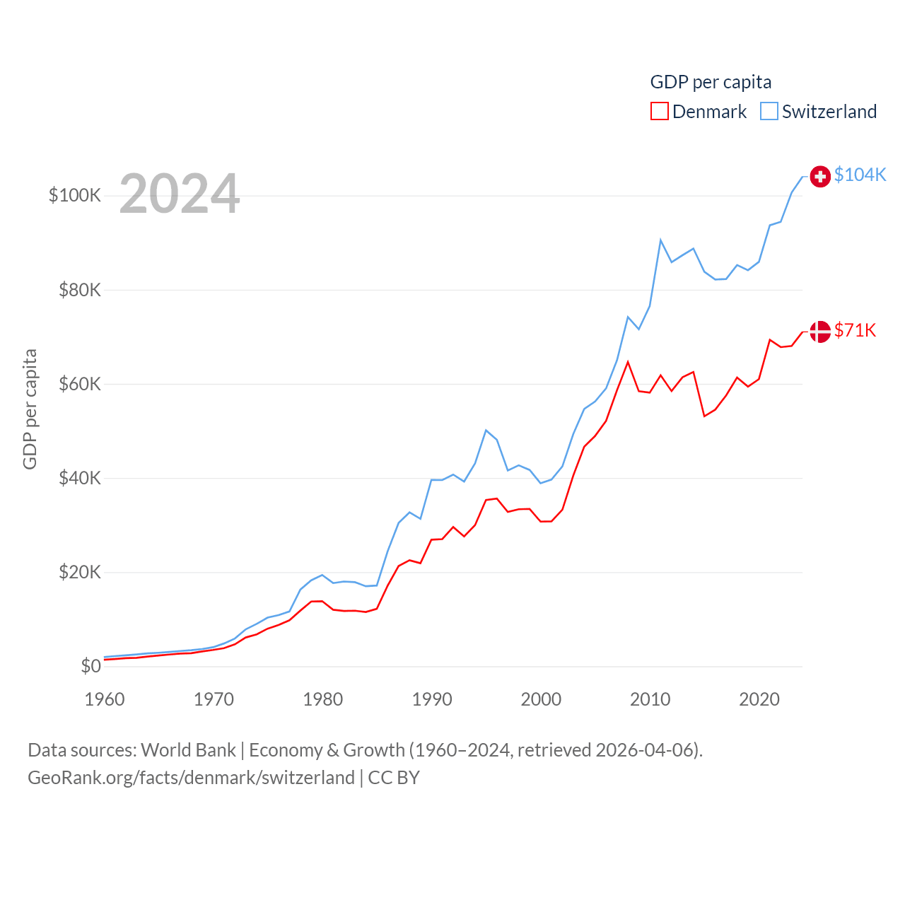 By GDP, Denmark ranks 37/197 ($425B) and Switzerland ranks 20/197 ($937B). By GDP per capita, Denmark ranks 12/197 ($71,026), while Switzerland ranks 5/197 ($103,998).