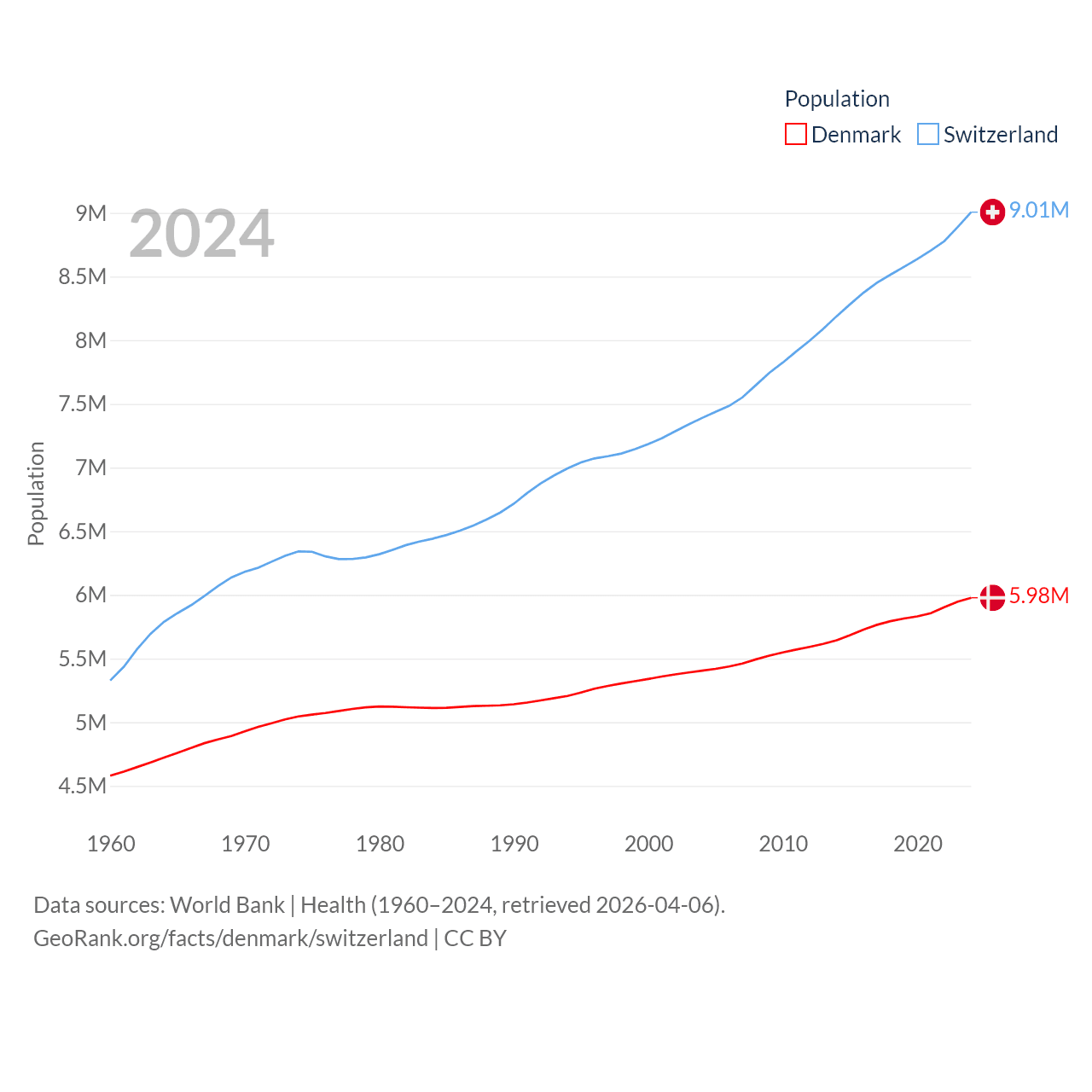 Denmark has a population of 5.98M (ranked 114/197), compared with 9.01M in Switzerland (ranked 101/197). Denmark's land area is 15,444 sq mi versus 15,255 sq mi for Switzerland (ranked 130th vs. 131st).