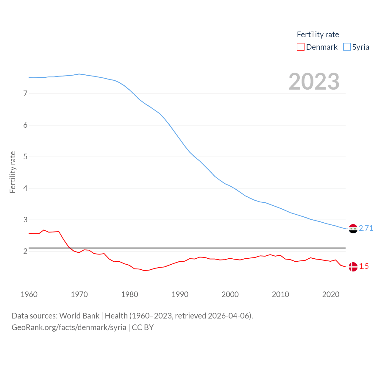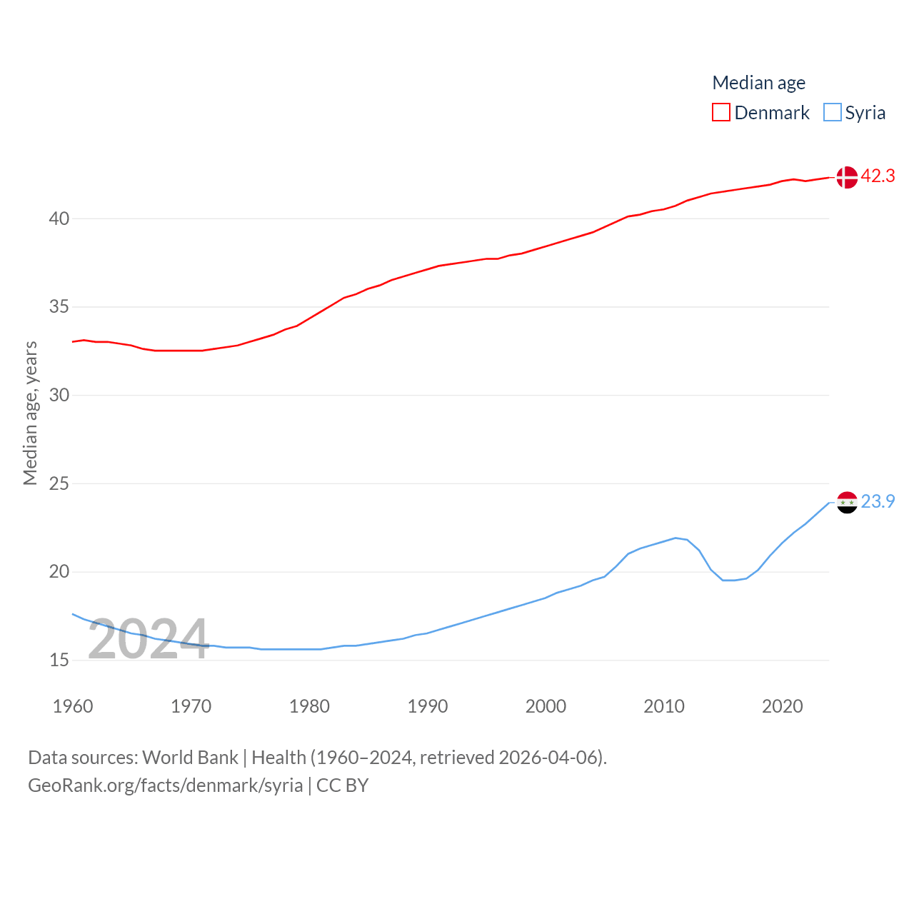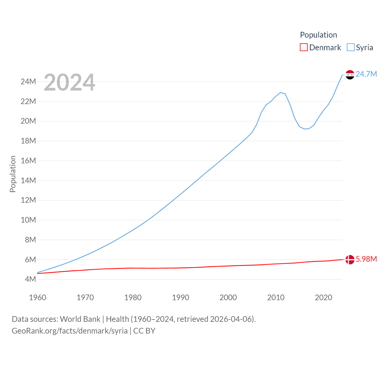 Denmark has a population of 5.98M (ranked 114/197), compared with 24.7M in Syria (ranked 57/197). Denmark's land area is 15,444 sq mi versus 70,900 sq mi for Syria (ranked 130th vs. 87th).