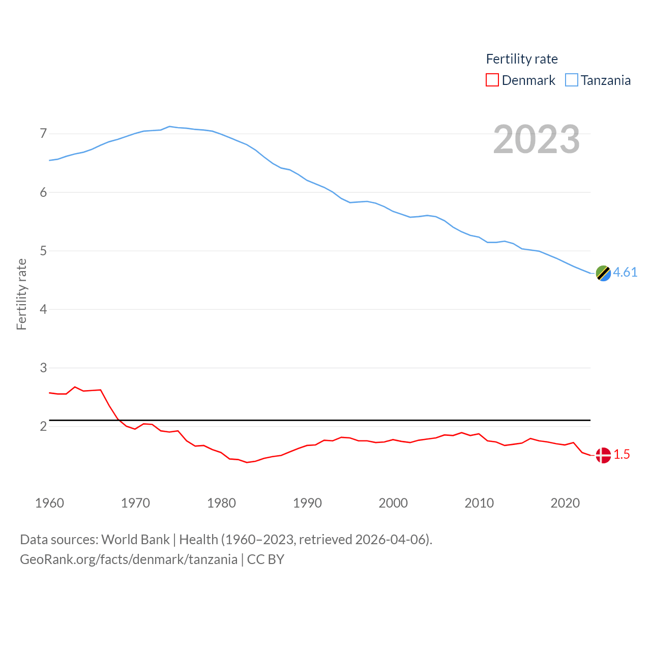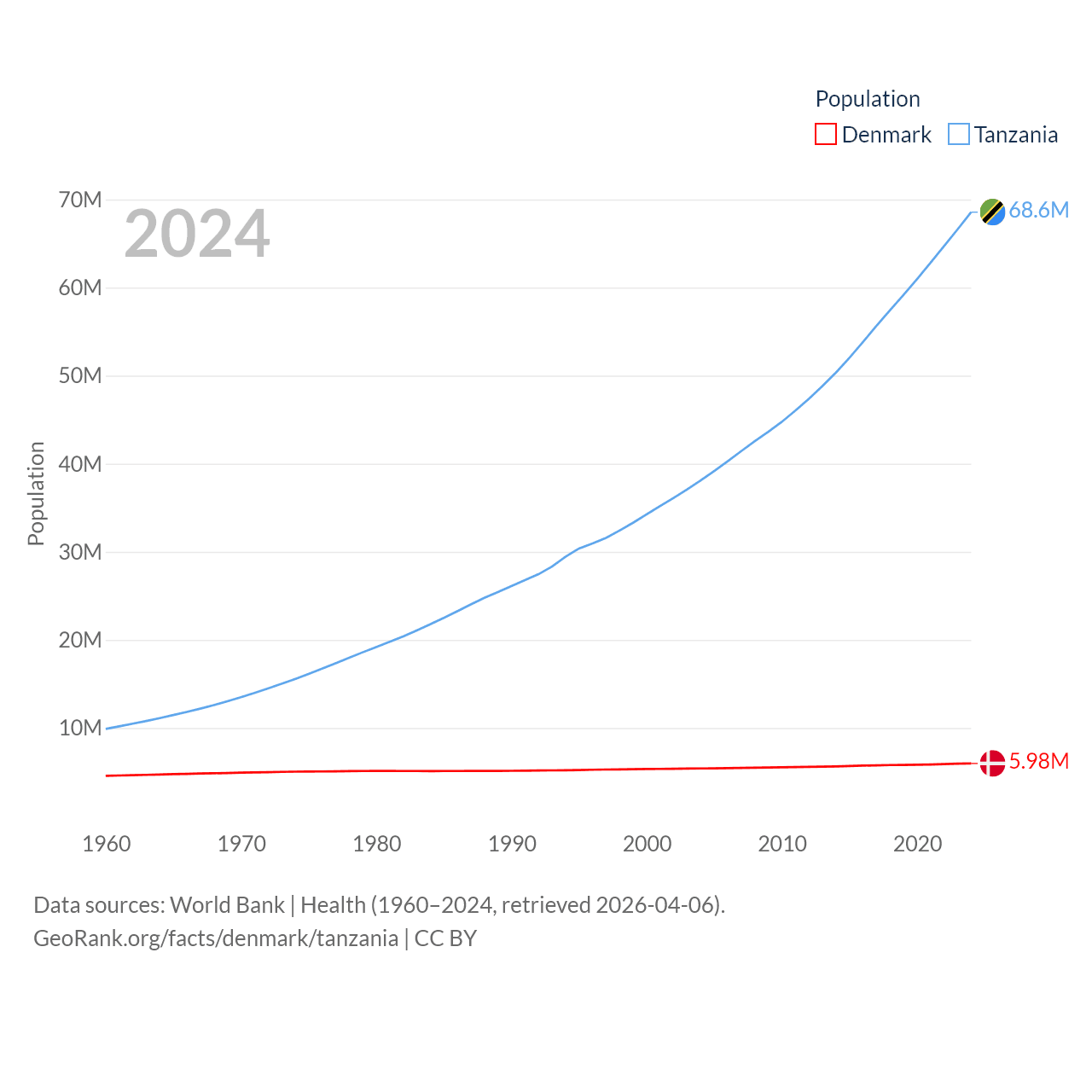 Denmark has a population of 5.98M (ranked 114/197), compared with 68.6M in Tanzania (ranked 22/197). Denmark's land area is 15,444 sq mi versus 342,009 sq mi for Tanzania (ranked 130th vs. 31st).