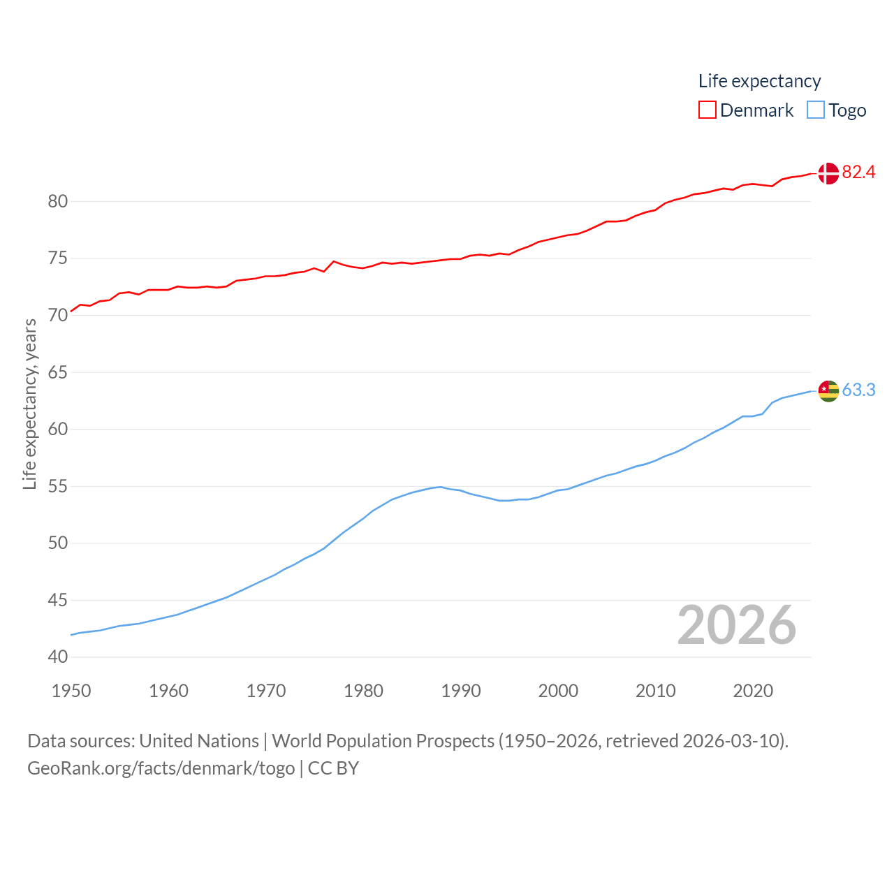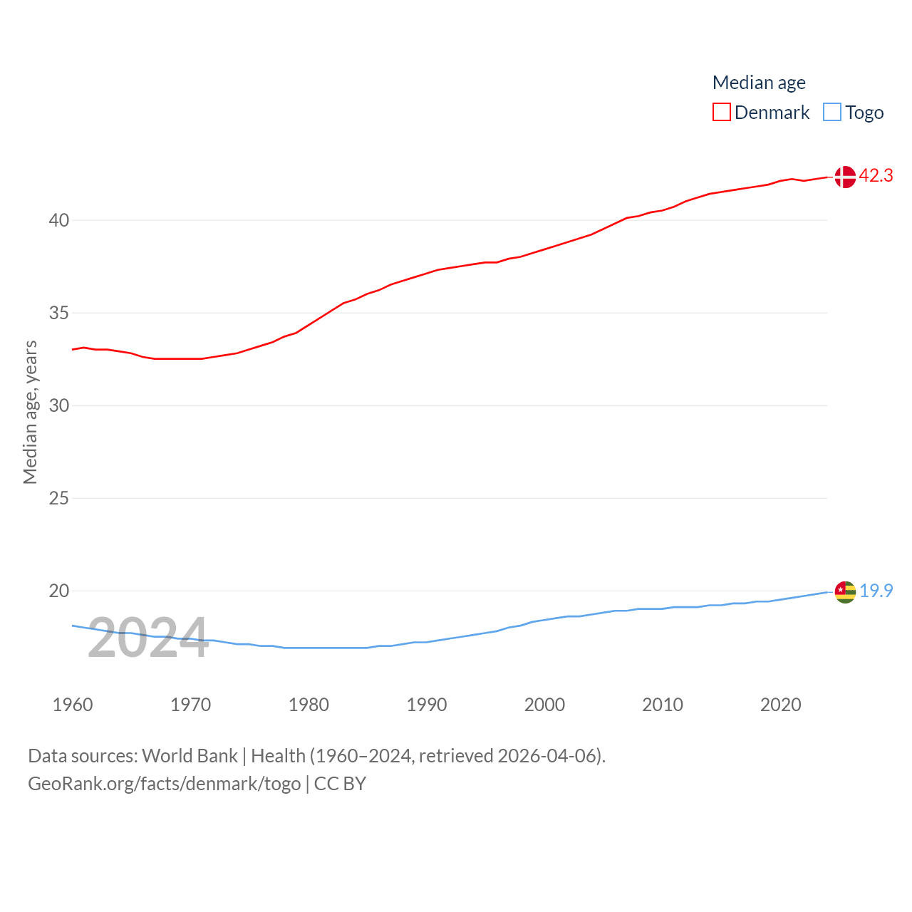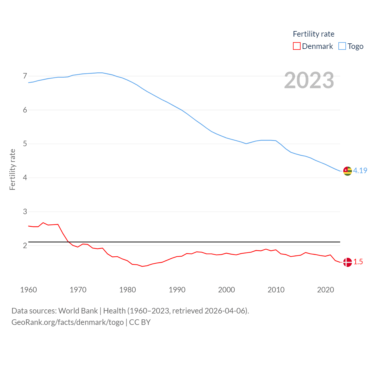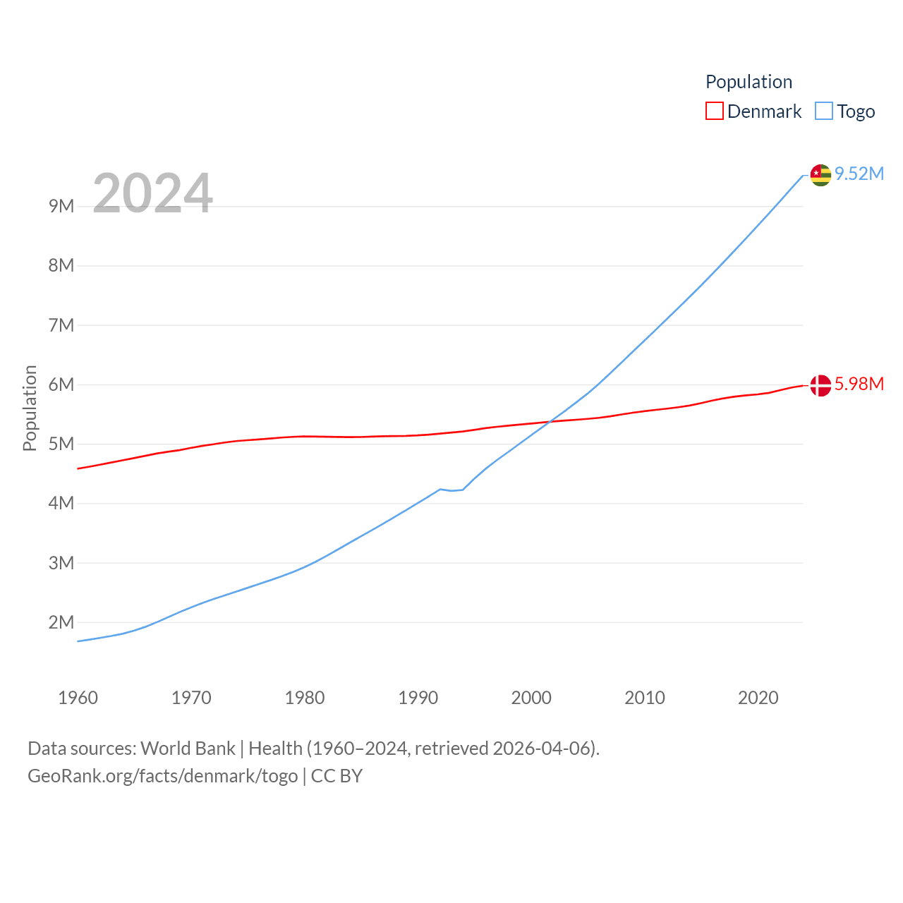 Denmark has a population of 5.98M (ranked 114/197), compared with 9.52M in Togo (ranked 98/197). Denmark's land area is 15,444 sq mi versus 21,000 sq mi for Togo (ranked 130th vs. 124th).