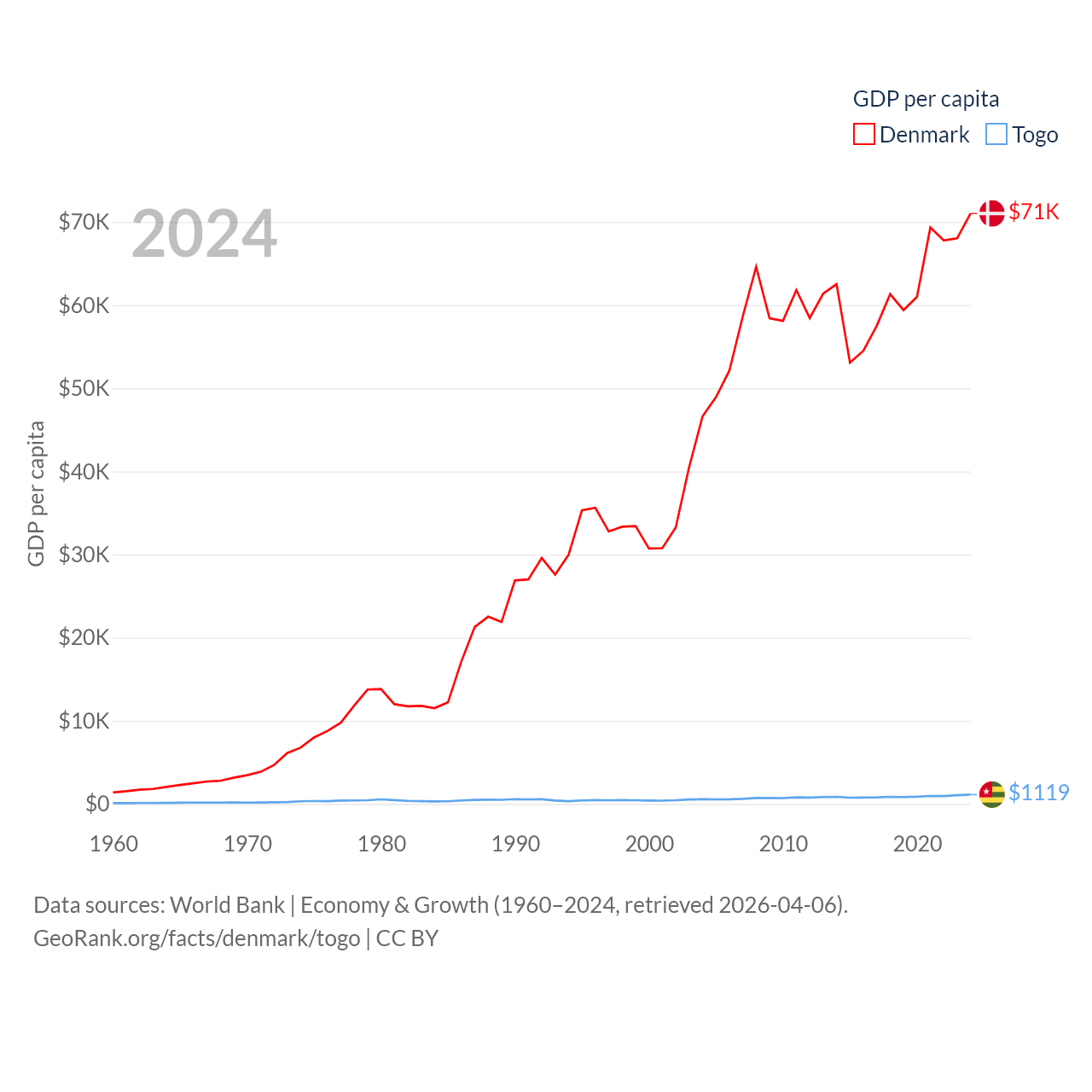By GDP, Denmark ranks 37/197 ($425B) and Togo ranks 154/197 ($10.7B). By GDP per capita, Denmark ranks 12/197 ($71,026), while Togo ranks 172/197 ($1,119).